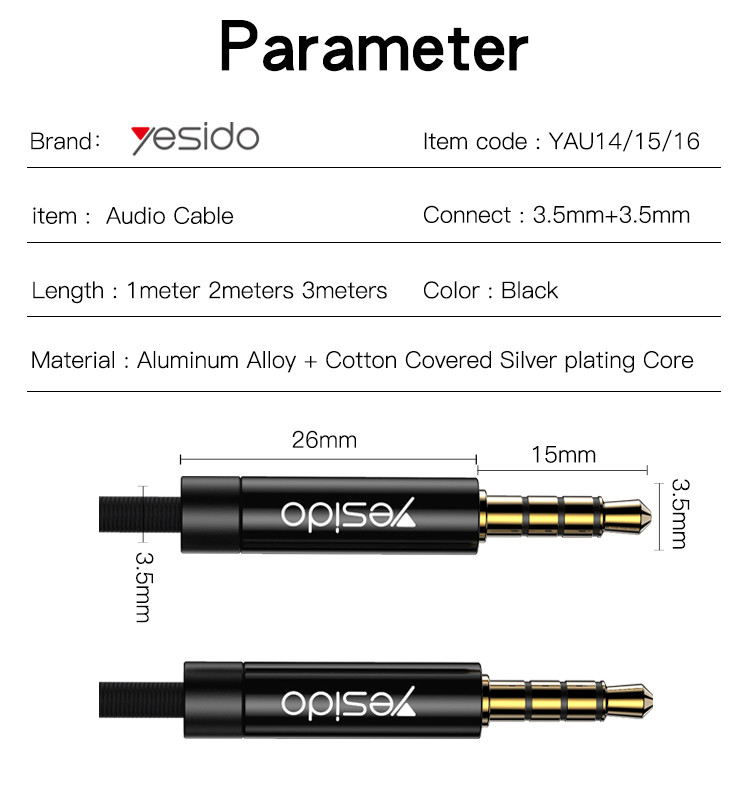 YAU16 3Meter 3.5mm to 3.5mm Audio CableYAU16 3m Nylon Braided 3.5Mm To 3.5Mm Jack plug Speakers Music Connection Aux Auxiliar Audio Cable.Support Mobile Phone/Tablet/MP4/MP3 to Audio Devices.Features3.5mm to 3.5mm Audio Cable.Aux Auxiliar Audio Cable.3 Meter Audio Adapter.YAU16 3Meter 3.5mm to 3.5mm Audio CableParameterBrand:YesidoItem Name:3 Meter 3.5mm To 3.5mm Audio CableMode:YAU16Apply to:mobile phone / tablet / laptop / othersMaterial:Aluminum alloy +Cotton Covered Silver Plating CoreFeatures:Support music displayOutput:not support powerG.W:63GYAU16 3Meter 3.5mm to 3.5mm Audio CableVideoProduct Using Video1. Connect the cable to a music source, like mobile phone/tablet/laptop/computer/MP4/MP32. Connect another type to display devices, like speaker, headset, and so on.Product Composition3Meter 3.5mm to 3.5mm Audio Cable.YAU16 3Meter 3.5mm to 3.5mm Audio CableDetailsFAQ1. what is the delivery time of theYAU16 3Meter 3.5mm to 3.5mm Audio Cable?Usually, the delivery time will be within 5-7 days.2. What you can do in OEM?We can help to design the customer’s logo on the products, and help to design the product packaging according to our standard3. How long is your warranty time?from the selling date, last for 1 year.