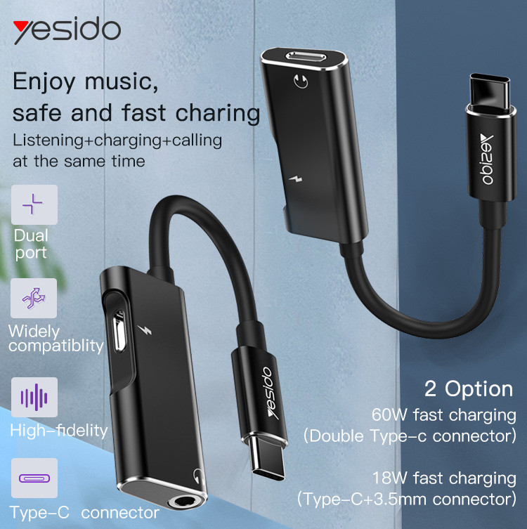 YAU22 2 in 1 TC To TC And 3.5mm Audio AdapterYAU22 Aluminum Alloy 2 in 1 Type-C To Type-C And 3.5mm Audio Splitter Line Adapter.Support Mobile Phone/Tablet/MP4/MP3 to Audio Devices.FeaturesType-C to Type-C And 3.5MM Audio Adapter.2 in 1 Audio Cable.Audio Adapter.Type-C Plug to 1*type-C port.1*3.5mm port.Type-C charging Max 18W.YAU22 2 in 1 TC To TC And 3.5mm Audio AdapterParameterBrand:YesidoItem Name:Type-C To Type-C And 3.5MM Audio AdapterMode:YAU22Apply to:mobile phone / tablet / laptop / othersMaterial:Aluminum alloy + PVCFeatures:Support music displayOutput:not support powerG.W:32GYAU22 2 in 1 TC To TC And 3.5mm Audio AdapterVideoProduct Using Video1. Connect the cable to a music source, like mobile phone/tablet/laptop/computer/MP4/MP32. Connect another type to display devices, like speaker, headset, and so on.Product Composition2 in 1 TC To TC And 3.5mm Audio Adapter.YAU22 2 in 1 TC To TC And 3.5mm Audio AdapterDetailsFAQ1. what is the delivery time of theYAU22 2 in 1 TC To TC And 3.5mm Audio Adapter?Usually, the delivery time will be within 5-7 days.2. What you can do in OEM?We can help to design the customer’s logo on the products, and help to design the product packaging according to our standard3. How long is your warranty time?from the selling date, last for 1 year.