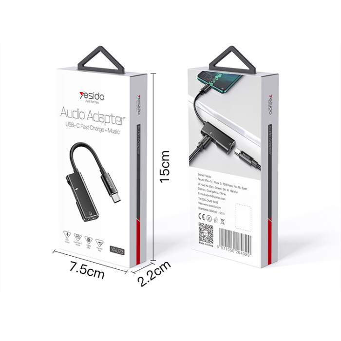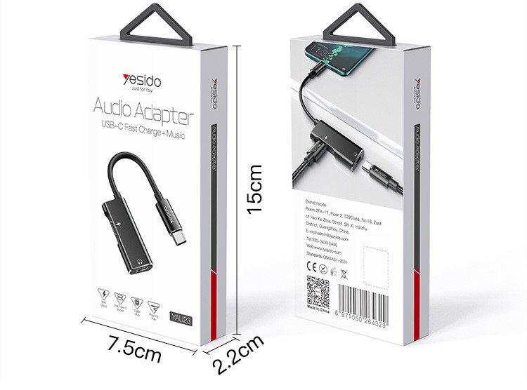 YAU23 Type-C To 3.5mm Audio AdapterYAU23 2 In 1 Mobile Phone Jack Audio Splitter Converter Adapter Type-C To 3.5Mm Audio Adapter.Support Mobile Phone/Tablet/MP4/MP3 to Audio Devices.FeaturesType-C Plug to 1 type-C port.1 type-C port.Type-C charging Max 60W.YAU23 Type-C To 3.5mm Audio AdapterParameterBrand:YesidoItem Name:Type-C To 3.5mm Audio AdapterMode:YAU23Apply to:mobile phone / tablet / laptop / othersMaterial:ABSFeatures:Support music displayOutput:not support powerG.W:32GYAU23 Type-C To 3.5mm Audio AdapterVideoProduct Using Video1. Connect the cable to a music source, like mobile phone/tablet/laptop/computer/MP4/MP32. Connect another type to display devices, like speaker, headset, and so on.Product CompositionType-C To 3.5mm Audio Adapter.YAU23 Type-C To 3.5mm Audio AdapterDetailsFAQ1. what is the delivery time of theYAU23 Type-C To 3.5mm Audio Adapter?Usually, the delivery time will be within 5-7 days.2. What you can do in OEM?We can help to design the customer’s logo on the products, and help to design the product packaging according to our standard3. How long is your warranty time?from the selling date, last for 1 year.