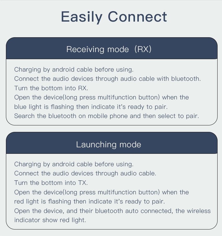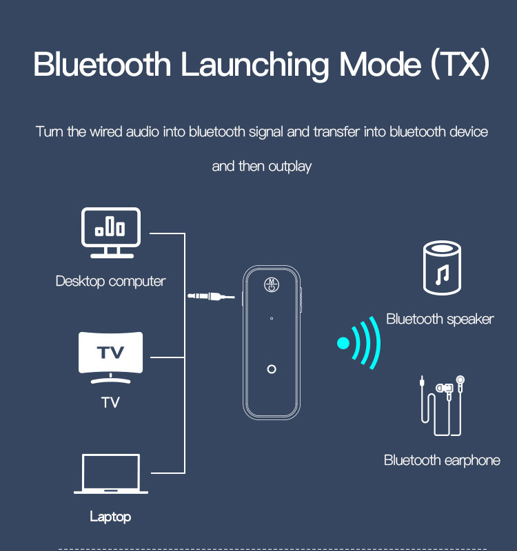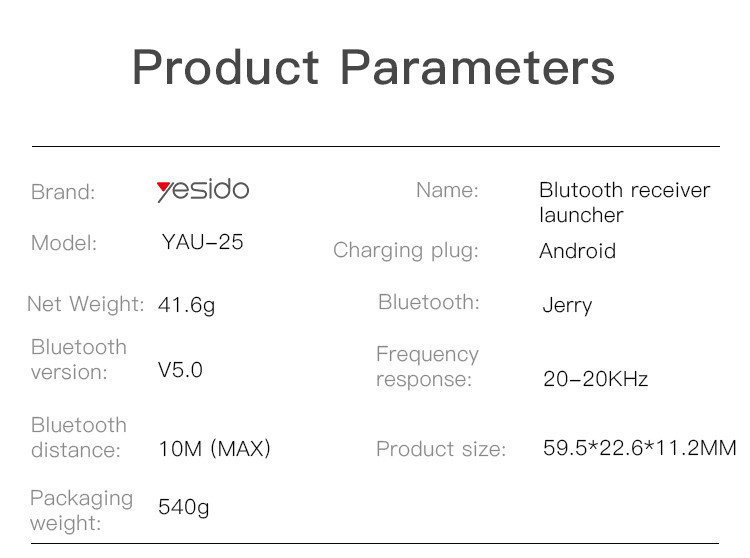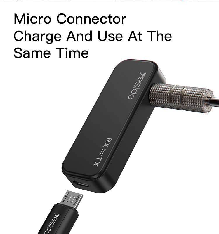 YAU25 Wireless Receiver To 3.5mm Bluetooth TransmitterYAU25 Mini Wireless Receiver To 3.5mm AUX Audio Transmitter Adapter.Support Mobile Phone/Tablet/MP4/MP3 to Audio Devices.FeaturesBluetooth 5.0 receiver.3.5mm plug connector.TX mode launch bluetooth.RX mode receiver bluetooth.Built-in battery.YAU25 Wireless Receiver To 3.5mm Bluetooth TransmitterParameterBrand:YesidoItem Name:Wireless Receiver To 3.5mm Bluetooth TransmitterMode:YAU25Apply to:mobile phone / tablet / laptop / othersMaterial:ABSFeatures:Support music displayOutput:not support powerG.W:57GYAU25 Wireless Receiver To 3.5mm Bluetooth TransmitterVideoProduct Using Video1. Connect the cable to a music source, like mobile phone/tablet/laptop/computer/MP4/MP32. Connect another type to display devices, like speaker, headset, and so on.Product CompositionWireless Receiver To 3.5mm Bluetooth Transmitter.YAU25 Wireless Receiver To 3.5mm Bluetooth TransmitterDetailsFAQ1. what is the delivery time of theYAU25 Wireless Receiver To 3.5mm Bluetooth Transmitter?Usually, the delivery time will be within 5-7 days.2. What you can do in OEM?We can help to design the customer’s logo on the products, and help to design the product packaging according to our standard3. How long is your warranty time?from the selling date, last for 1 year.