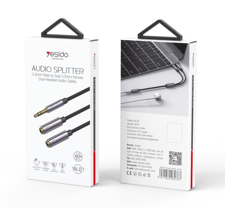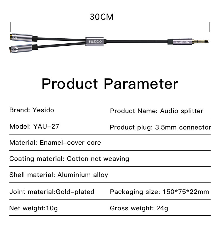 YAU27 3.5mm Male To Female Adapter Audio CableYAU27 15cm Nylon Braided 3.5mm Male Jack To Female Port Earphone Splitter AUX Audio Cable.Support Mobile Phone/Tablet/MP4/MP3 to Audio Devices.Features30cm.3.5mm male plug to 3.5mm female port (2 ports).YAU27 3.5mm Male To Female Adapter Audio CableParameterBrand:YesidoItem Name:3.5mm Male To Female Audio Splitted CableMode:YAU27Apply to:mobile phone / tablet / laptop / othersMaterial:ABSFeatures:Support music displayOutput:not support powerG.W:31GYAU27 3.5mm Male To Female Adapter Audio CableVideoProduct Using Video1. Connect the cable to a music source, like mobile phone/tablet/laptop/computer/MP4/MP32. Connect another type to display devices, like speaker, headset, and so on.Product Composition3.5 mm Male To Female Audio Splitted Cable.YAU27 3.5mm Male To Female Adapter Audio CableDetailsFAQ1. what is the delivery time of theYAU27 3.5mm Male To Female Adapter Audio Cable?Usually, the delivery time will be within 5-7 days.2. What you can do in OEM?We can help to design the customer’s logo on the products, and help to design the product packaging according to our standard3. How long is your warranty time?from the selling date, last for 1 year.