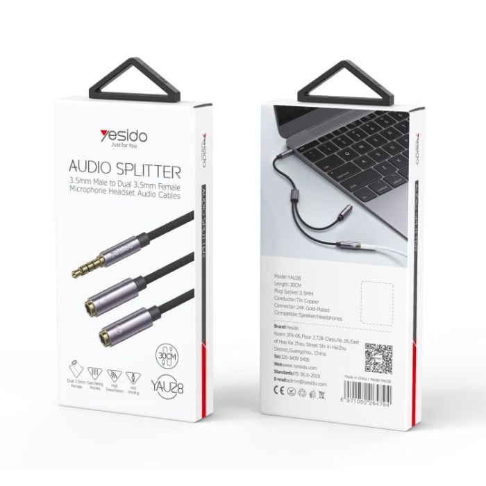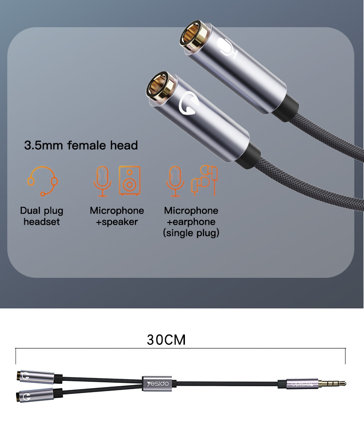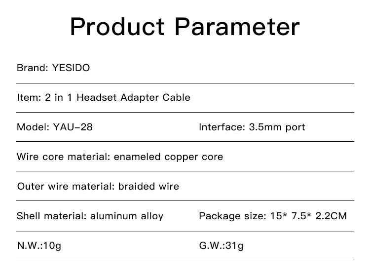 YAU28 3.5mm 2 in 1 Headset Adapter CableYAU28 15cm 3.5mm Male Jack To Female Earphone And Microphone Port AUX Audio Cable.Support Mobile Phone/Tablet/MP4/MP3 to Audio Devices.Features30cm.3.5mm male plug to 3.5mm female port.1 plug for microphone.1 plug for earphone/headset.YAU28 3.5mm 2 in 1 Headset Adapter CableParameterBrand:YesidoItem Name:3.5mm 2 IN 1 Male Headset Adapter CableMode:YAU28Apply to:mobile phone / tablet / laptop / othersMaterial:ABSFeatures:Support music displayOutput:not support powerG.W:31GYAU28 3.5mm 2 in 1 Headset Adapter CableVideoProduct Using Video1. Connect the cable to a music source, like mobile phone/tablet/laptop/computer/MP4/MP32. Connect another type to display devices, like speaker, headset, and so on.Product Composition3.5 mm Male To Female Audio Splitted Cable.YAU28 3.5mm 2 in 1 Headset Adapter CableDetailsFAQ1. what is the delivery time of theYAU28 3.5mm 2 in 1 Headset Adapter Cable?Usually, the delivery time will be within 5-7 days.2. What you can do in OEM?We can help to design the customer’s logo on the products, and help to design the product packaging according to our standard3. How long is your warranty time?from the selling date, last for 1 year.