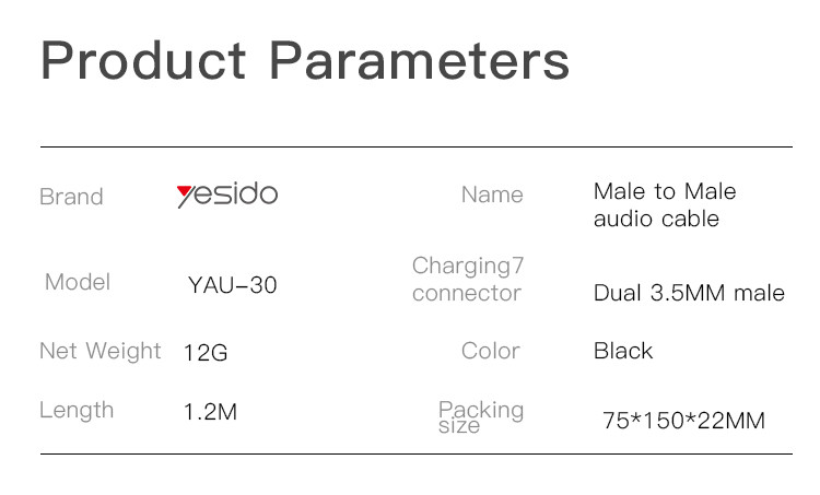 YAU30 3.5mm Male Plug Audio Splitted CableYAU30 Wholesale Nylon Braided Splitter 3.5mm Plug With Volume Control Aux Audio Cable.Support Mobile Phone/Tablet/MP4/MP3 to Audio Devices.Features1 meter.3.5mm male plug (2 plugs) to 3.5mm male plug.add remote control to headset.volume control.YAU30 3.5mm Male Plug Audio Splitted CableParameterBrand:YesidoItem Name:3.5mm Male Plug Audio Splitted CableMode:YAU30Apply to:mobile phone / tablet / laptop / othersMaterial:ABSFeatures:Support music displayOutput:not support powerG.W:35GYAU30 3.5mm Male Plug Audio Splitted CableVideoProduct Using Video1. Connect the cable to a music source, like mobile phone/tablet/laptop/computer/MP4/MP32. Connect another type to display devices, like speaker, headset, and so on.Product Composition3.5 mm Male Plug Audio Splitted Cable.YAU30 3.5mm Male Plug Audio Splitted CableDetailsFAQ1. what is the delivery time of theYAU30 3.5mm Male Plug Audio Splitted Cable?Usually, the delivery time will be within 5-7 days.2. What you can do in OEM?We can help to design the customer’s logo on the products, and help to design the product packaging according to our standard3. How long is your warranty time?from the selling date, last for 1 year.