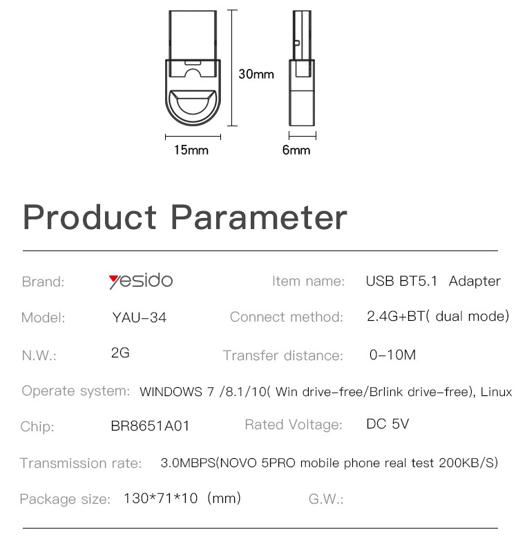 Short description: YAU34 Mini USB Bluetooth Adapter ReceiverYAU34 Mini USB Bluetooth Adapter Receiver Wireless Mini USB Bluetooth 5.1 Receiver For Computer.Support Mobile Phone/Tablet/MP4/MP3 to Audio Devices.Features2.4Ghz.USB Pin.Bluetooth 5.1.Can for Data transmit.Mini USB Bluetooth Adapter Receiver.YAU34 Mini USB Bluetooth Adapter ReceiverParameterBrand:YesidoItem Name:Mini USB Bluetooth Adapter ReceiverMode:YAU34Apply to:tablet / laptop / computer / othersMaterial:PC + Aluminum AlloyFeatures:Support music displayOutput:not support powerG.W:20GYAU34 Mini USB Bluetooth Adapter ReceiverVideoProduct Using Video1. Connect the adapter receiver to a laptop/computer.2. Connect another type to display devices, like speaker, headset, and so on.Product CompositionMini USB Bluetooth Adapter ReceiverYAU34 Mini USB Bluetooth Adapter ReceiverDetailsFAQ1. what is the delivery time of theYAU34 Mini USB Bluetooth Adapter Receiver?Usually, the delivery time will be within 5-7 days.2. What you can do in OEM?We can help to design the customer’s logo on the products, and help to design the product packaging according to our standard3. How long is your warranty time?from the selling date, last for 1 year.