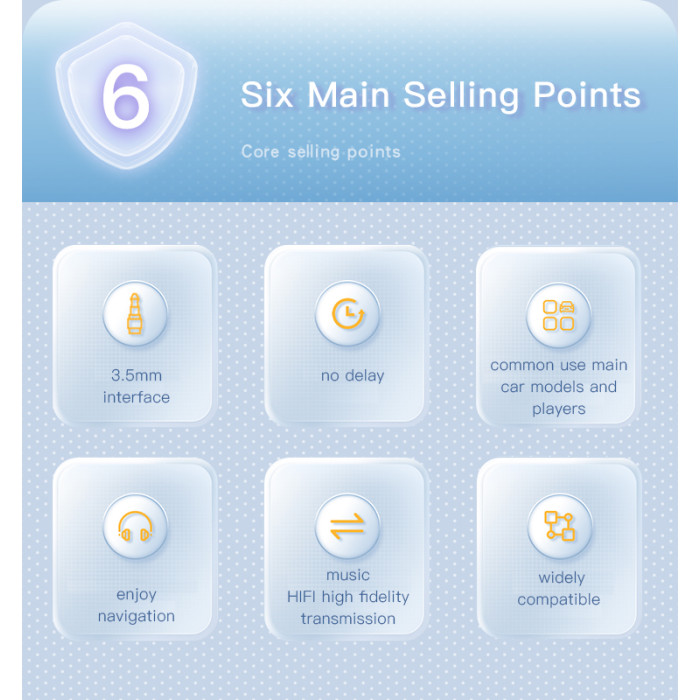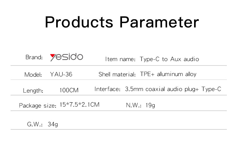 YAU36 Type-C To 3.5MM Plug Audio Cable1 Meter Type-C plug to 3.5mm Jack plug.Support Mobile Phone/Tablet/MP4/MP3 to Audio Devices.FeaturesSupport music display.Supoort high quality sounds concert.Can be used on car audio connection.YAU36 Type-C To 3.5MM Plug Audio CableParameterBrand:YesidoItem Name:Type-C to 3.5mm Audio CableMode:Yau36Apply to:mobile phone / tablet / laptop / othersMaterial:Nylon Braided cable + Aluminum AlloyFeatures:Support music displayOutput:not support powerG.W:40GYAU36 Type-C To 3.5MM Plug Audio CableVideoProduct Using Video1. Connect the cable to a music source, like mobile phone/tablet/laptop/computer/MP4/MP32. Connect another type to display devices, like speaker, headset, and so on.Product Composition1 Meter Audio cablesType-C to 3.5mm portYAU36 Type-C To 3.5MM Plug Audio CableDetailsFAQ1. what is the delivery time of theYAU36 Type-C To 3.5MM Plug Audio Cable?Usually, the delivery time will be within 5-7 days.2. What you can do in OEMWe can help to design the customer’s logo on the products, and help to design the product packaging according to our standard3. How long is your warranty time?from the selling date, last for 1 year.