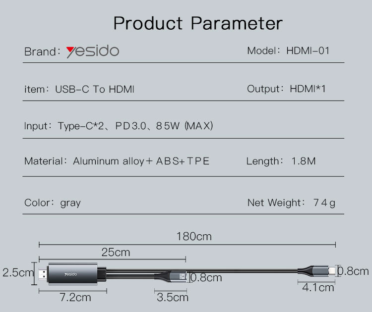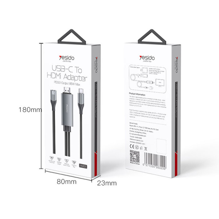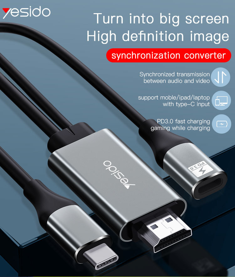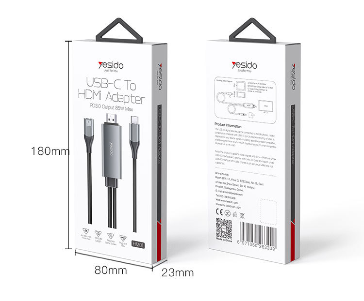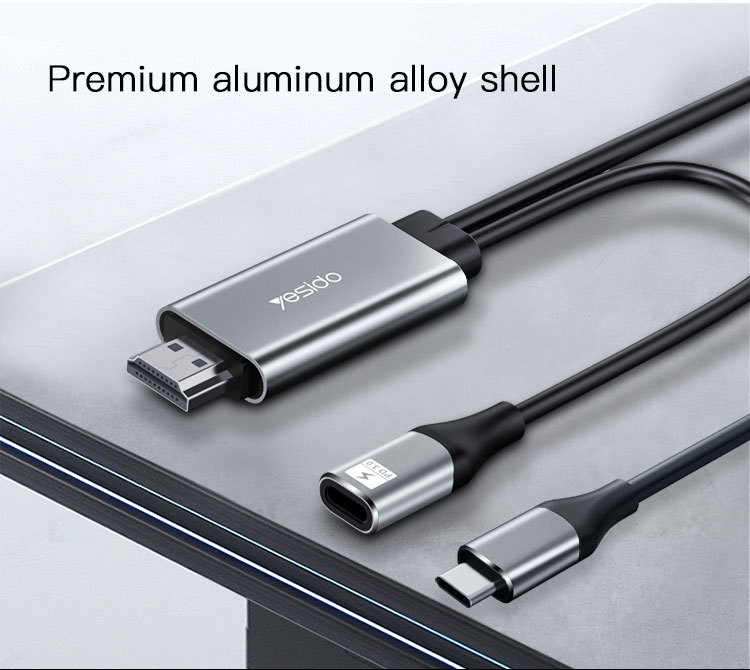 HM01 Type-C To HDMI Video Cable1.8 mType-Cto HDMI Video, can support max 4k 60Hz or below resoluction.HM01 Professional 4K 60HZ Type-C to HDMI Audio Video & PD Fast charging Audio Cable.Support Mobile Phone/Tablet, directly connect to video devices.FeaturesSupport High Clear Max4K video.Type-C PD fast charging.Type-C to HDMI Video Cable.Video And Audio together.USB charging.HM01 Type-C To HDMI Video CableParameterBrand:YesidoItem Name:Type-C to HDMI Video CableMode:HM01Apply to:mobile phone / tablet / laptop / othersMaterial:ABS + Aluminum Alloy + TPEFeatures:Support Video displayOutput:not support powerG.W:93GHM01 Type-C To HDMI Video CableVideoProduct Using Video1. Connect the cable to a video source, like mobile phone/tablet2. Connect another type to display devices, like mornitor / television/projector3. Scan the code on the screen and follow the usingProduct CompositionUSB chargingType-C to HDMIHM01 Type-C To HDMI Video CableDetailsFAQ1. what is the delivery time of theHM03 Type-C To HDMI Video Cable?Usually, the delivery time will be within 5-7 days.2. What you can do in OEM?We can help to design the customer’s logo on the products, and help to design the product packaging according to our standard3. How long is your warranty time?from the selling date, last for 1 year.