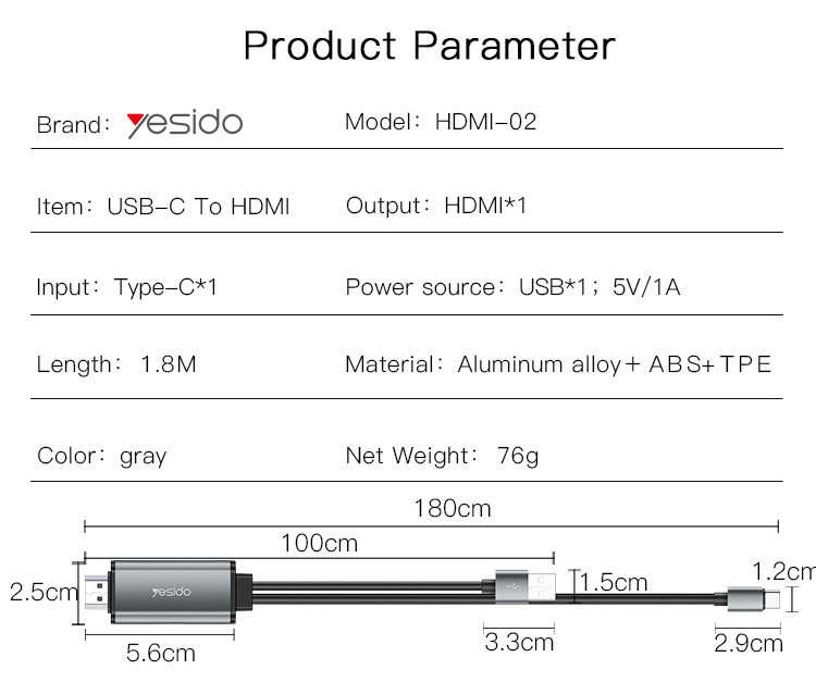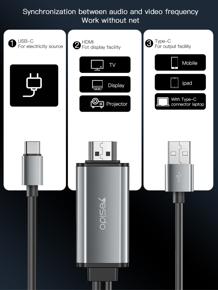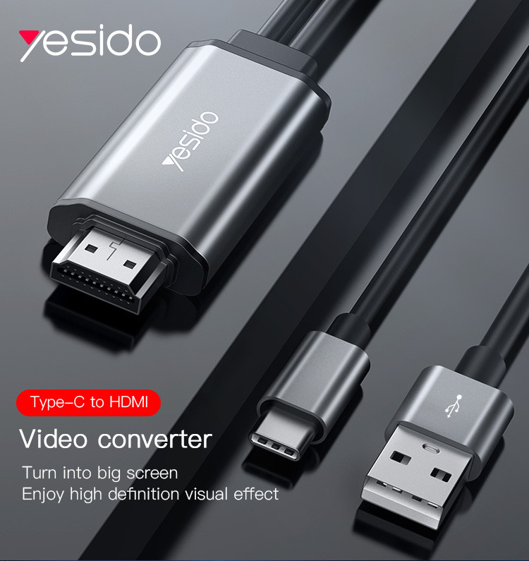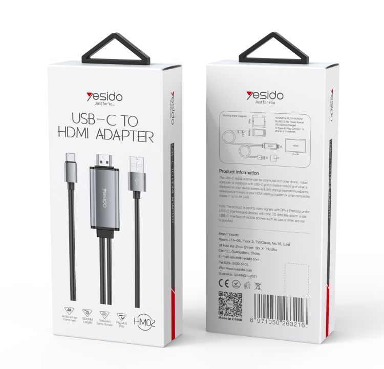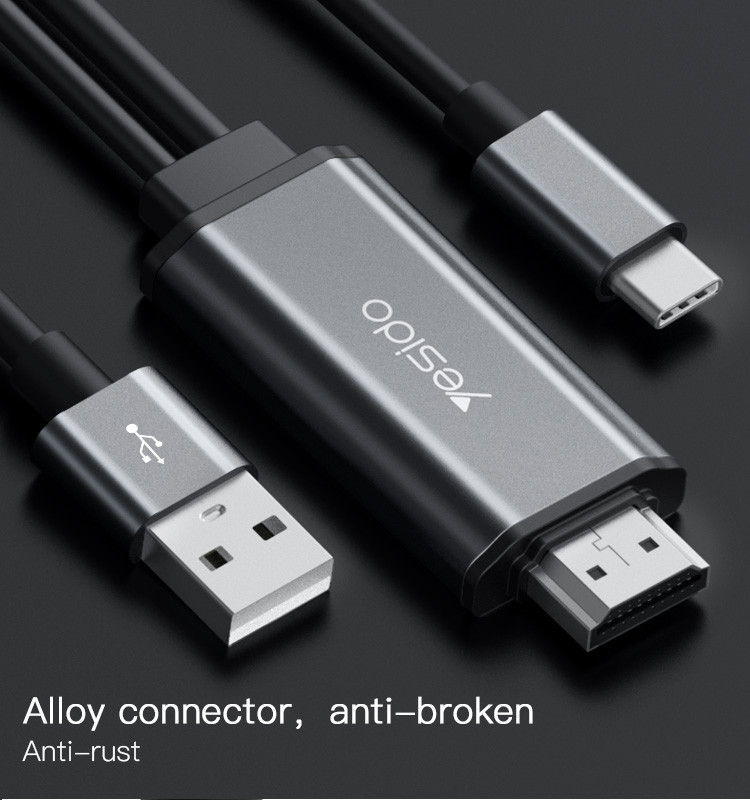 HM02 Type-C To HDMI Video Cable2 mType-Cto HDMI Video, can support max 4k 60Hz or below resoluction.HM02 USB Charging 1080p 4K 60HZ TYPE-C To HDMI Video Cable Adapter.Support Mobile Phone/Tablet, directly connect to video devices.FeaturesType-C to HDMI.4K/60hZ High 3D Effect.1.8 meters.HM02 Type-C To HDMI Video CableParameterBrand:YesidoItem Name:Type-C to HDMI Video CableMode:HM02Apply to:mobile phone / tablet / laptop / othersMaterial:ABS + Aluminum Alloy + TPEFeatures:Support Video displayOutput:not support powerG.W:93GHM02 Type-C To HDMI Video CableVideoProduct Using Video1. Connect the cable to a video source, like mobile phone/tablet2. Connect another type to display devices, like mornitor / television/projector3. Scan the code on the screen and follow the usingProduct CompositionUSB chargingType-C to HDMIHM02 Type-C To HDMI Video CableDetailsFAQ1. what is the delivery time of theHM02 Type-C To HDMI Video Cable?Usually, the delivery time will be within 5-7 days.2. What you can do in OEM?We can help to design the customer’s logo on the products, and help to design the product packaging according to our standard3. How long is your warranty time?from the selling date, last for 1 year.