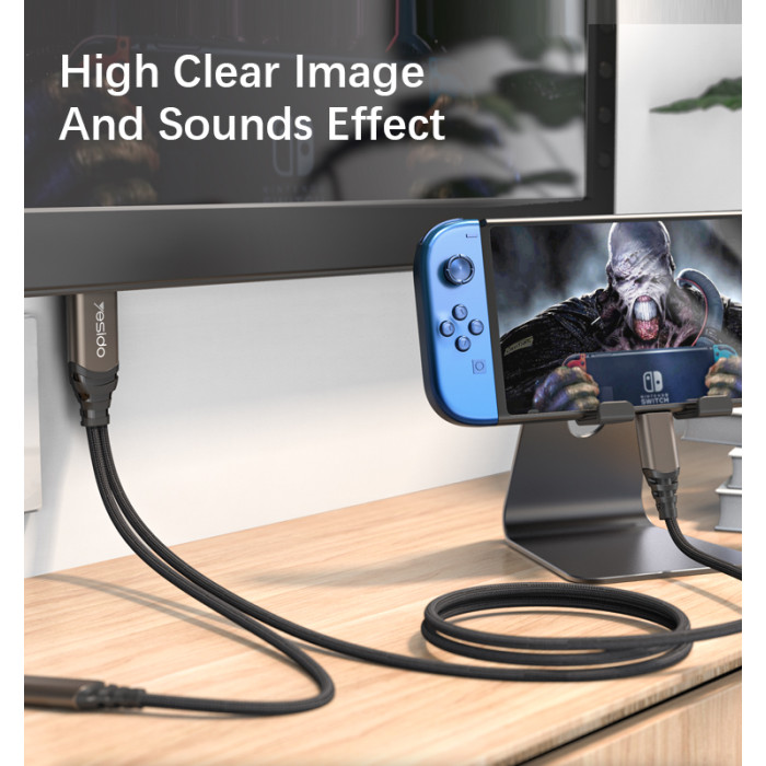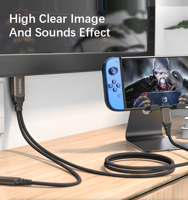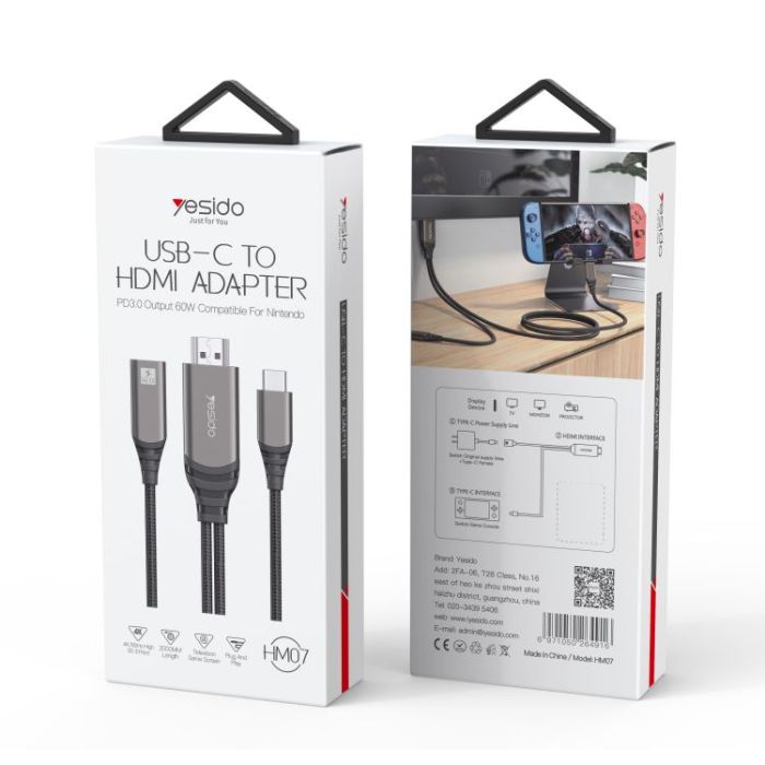 HM07 Type-C To HDMI Video Cable2 mType-Cto HDMI Video, can support max 4k 60Hz or below resoluction.HM07 2 Meters 4K 60HZ Type-C To HDMI Video Cable & PD Fast Charging Audio Cable.Support Mobile Phone/Tablet, directly connect to video devices.FeaturesType-C to HDMI.4K/60hZ High 3D Effect.2 meters.PD3.0 charging port.Compatible for Nintendo.HM07 Type-C To HDMI Video CableParameterBrand:YesidoItem Name:Type-C to HDMI Video CableMode:HM07Apply to:mobile phone / tablet / laptop / othersMaterial:ABS + Aluminum Alloy + TPEFeatures:Support Video displayOutput:not support powerG.W:120GHM07 Type-C To HDMI Video CableVideoProduct Using Video1. Connect the cable to a video source, like mobile phone/tablet2. Connect another type to display devices, like mornitor / television/projector3. Scan the code on the screen and follow the usingHM07 Type-C To HDMI Video CableDetailsFAQ1. what is the delivery time of theHM07 Type-C To HDMI Video Cable?Usually, the delivery time will be within 5-7 days.2. What you can do in OEM?We can help to design the customer’s logo on the products, and help to design the product packaging according to our standard3. How long is your warranty time?from the selling date, last for 1 year.