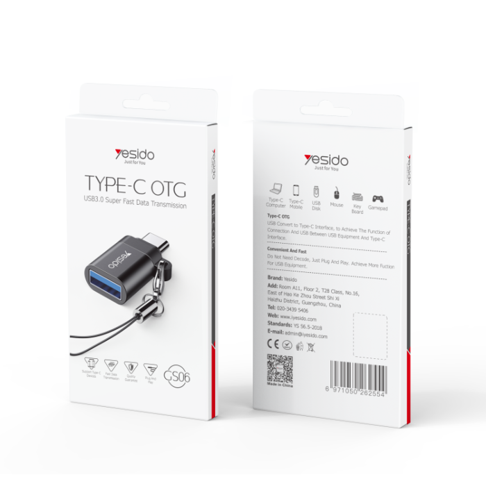 GS06 Type-C to USB-A OTG AdapterGS06 Mini Function Mobile Phone Power Data Transmit Convert Card Reader Type-C To USB OTG Adapter.FeaturesType-C to USB-A.USB for mouse/ keyboard/ camera/U-Disk/mobile phone.OTG Adapter.GS06 Type-C to USB-A OTG AdapterParameterBrand:YesidoItem Name:GS06 Type-Cto USBOTG AdapterMode:GS06Apply to:mobile phone / tablet / laptop / othersMaterial:PC + Aluminum AlloyFeatures:Support Data and chargingOutput:According to devicesG.W:22GGS06 Type-C to USB-A OTG AdapterVideoProduct Using Video1. Insert the adapter to mobile phone/tablet.2. Connect the Type-C cable.GS06 Type-C to USB-A OTG AdapterDetailsFAQ1. what is the delivery time of the Yesido GS06 Type-C to USB-A OTG Adapter?Usually, the delivery time will be within 5-7 days.2. What you can do in OEM?We can help to design the customer’s logo on the products, and help to design the product packaging according to our standard3. How long is your warranty time?from the selling date, last for 1 year.