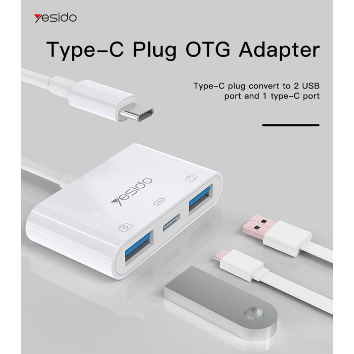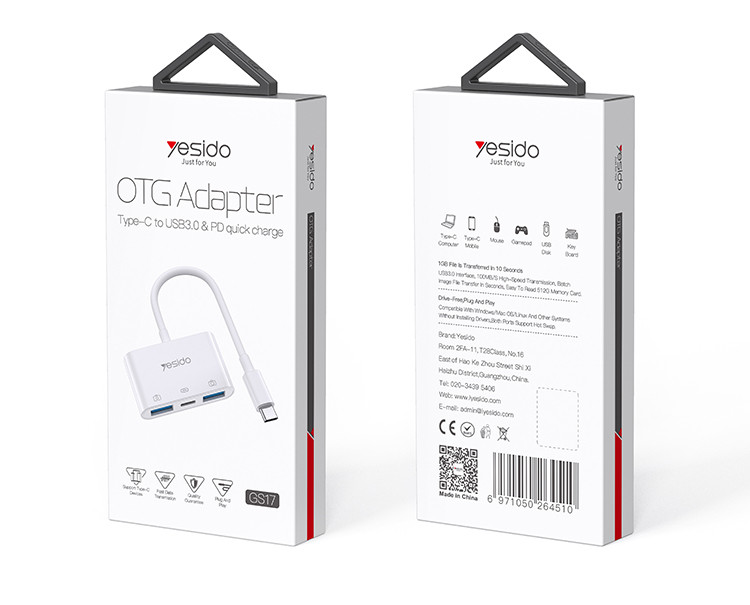 Yesido GS17 Type-C OTGGS17 3 In 1 Type C Otg Adapter Connector Usb Fast Charger Splitter Female To Male Converter Cable.FeaturesPlastic Shell.3 in 1 design.Type-C to 2USB + 1TC fast charge.USB for mouse/ keyboard/ camera/U-Disk/mobile phone.Yesido GS17 Type-C OTGParameterBrand:YesidoItem Name:Type-C OTGMode:GS17Apply to:mobile phone / tablet / laptop / othersMaterial:PCFeatures:Support Data and chargingOutput:According to devicesG.W:37GYesido GS17 Type-C OTGVideoProduct Using Video1. Insert the adapter to mobile phone/tablet.2. Connect the Type-C cable.Yesido GS17 Type-C OTGDetailsFAQ1. what is the delivery time of the yesidoGS17 Type-C OTG?Usually, the delivery time will be within 5-7 days.2. What you can do in OEM?We can help to design the customer’s logo on the products, and help to design the product packaging according to our standard3. How long is your warranty time?from the selling date, last for 1 year.
