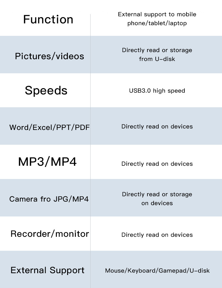 USB for mouse/ keyboard/ camera/U-Disk/mobile phone.