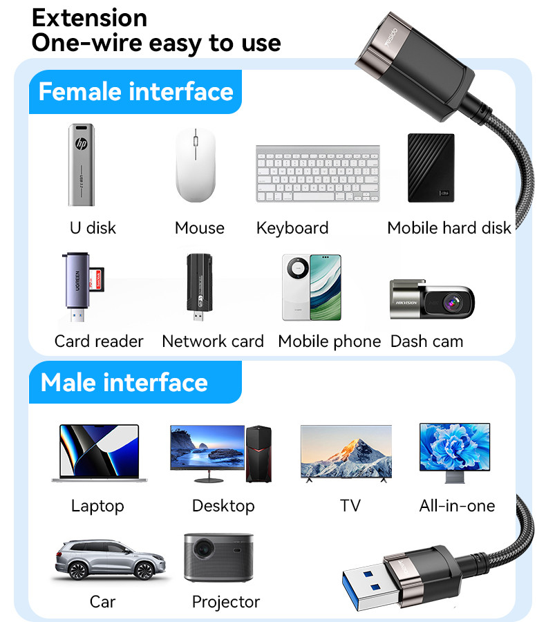 GS26 Male USB to Female USB USB Cable ExtenderGS26 Yesido 1.5M Braided Cable Aluminum Alloy High-speed Transmission USB 2.0 Extension Cable.FeaturesAluminum Alloy Shell.Male USB to Female USB.Aluminum Alloy + ABS + Nylon.USB2.0.1.5 Meter.GS26 Male USB to Female USB USB Cable Extender ParameterBrand:YesidoItem Name:Male USB to Female USB USB Cable ExtenderMode:GS26Apply to:mobile phone / tablet / laptop / othersMaterial:Aluminum AlloyFeatures:Support Data and chargingOutput:According to devicesG.W:72GGS26 Male USB to Female USB USB Cable ExtenderParameterProduct CompositionGS26 Male USB to Female USB USB Cable Extender1. Insert the adapter to mobile phone/tablet.2. Connect the USB cable.GS26 Male USB to Female USB USB Cable Extender DetailsFAQ1. what is the delivery time of the GS26 Male USB to Female USB USB Cable Extender?Usually, the delivery time will be within 5-7 days.2. What you can do in OEM?We can help to design the customer’s logo on the products, and help to design the product packaging according to our standard3. How long is your warranty time?from the selling date, last for 1 year.