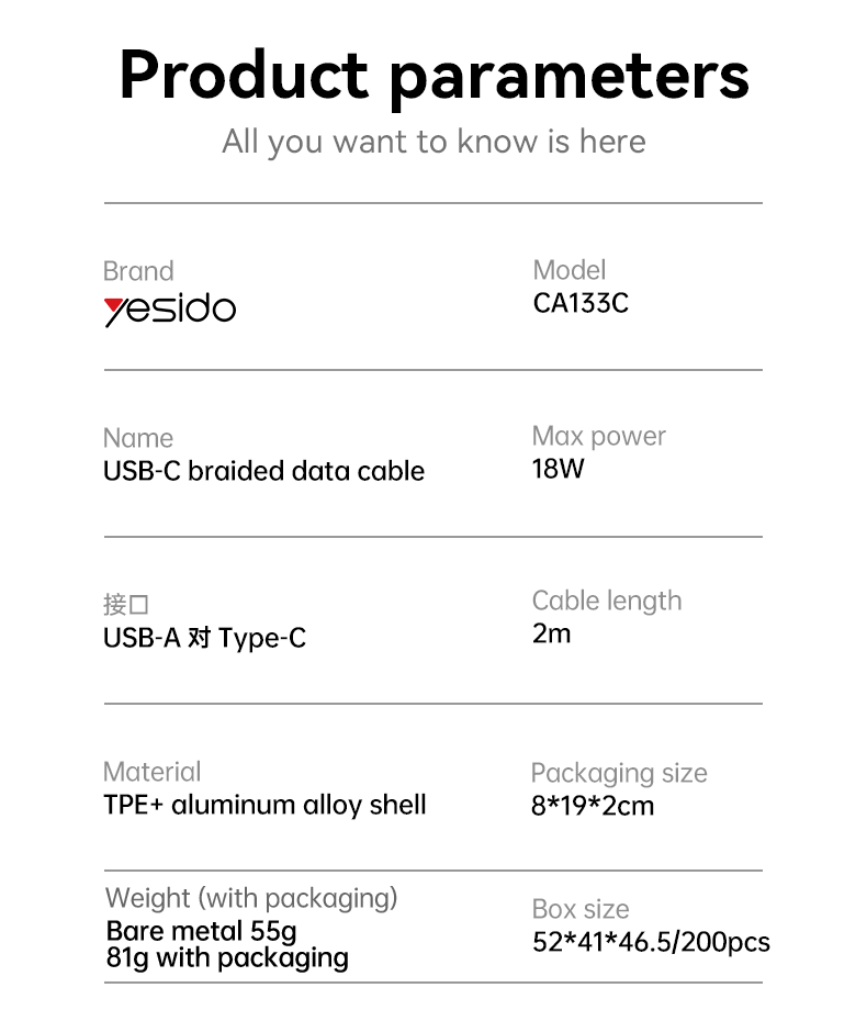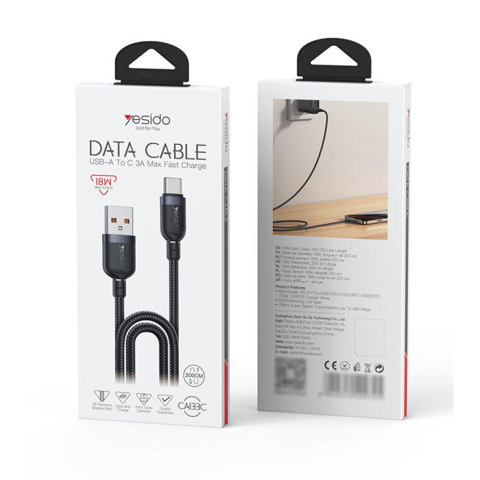 Short description: CA133C USB to Type-C 18W Fast Charging Data CableCA133C Yesido 2 Meter 18W Fast Charging USB to Type-C Aluminum Alloy Braided Data Cable.Support protocol of QC, PD, PPS, SCP, SVP, VOOC and so on.FeaturesOur Data Cable support max 18W charging.Data Cable is USB to TC.It can charge the mobile phone, tablet, laptop and other devices.It supports charging and data transmit.Material: Nylon Braided Cable + TPE+Aluminum Alloy.Cable Core: (55/0.08TC+250D)*2C+(16/0.08TC+250D)*2C, OD: 4.0mm2 meters Long.Standard Max 18W.CA133C USB to Type-C 18W Fast Charging Data CableParameterBrand:YesidoItem Name:USB to TC Data CableMode:CA133CApply to:mobile phone / tablet / laptop / othersMaterial:Nylon Braided Cable +TPE+Aluminum AlloyFeatures:Output:18W maxG.W:81GCA133C USB to Type-C 18W Fast Charging Data Cable ParameterProduct CompositionCA133C USB to Type-C 18W Fast Charging Data Cable.1. Connect the cable to a wall charger / laptop2. Connect another type to devicesCA133C USB to Type-C 18W Fast Charging Data Cable DetailsFAQ1. what is the delivery time of theCA133C USB to Type-C 18W Fast Charging Data Cable?Usually, the delivery time will be within 5-7 days.2. What you can do in OEMWe can help to design the customer’s logo on the products, and help to design the product packaging according to our standard3. How long is your warranty time?from the selling date, last for 1 year.