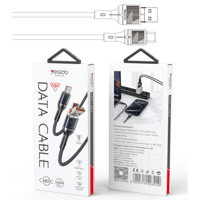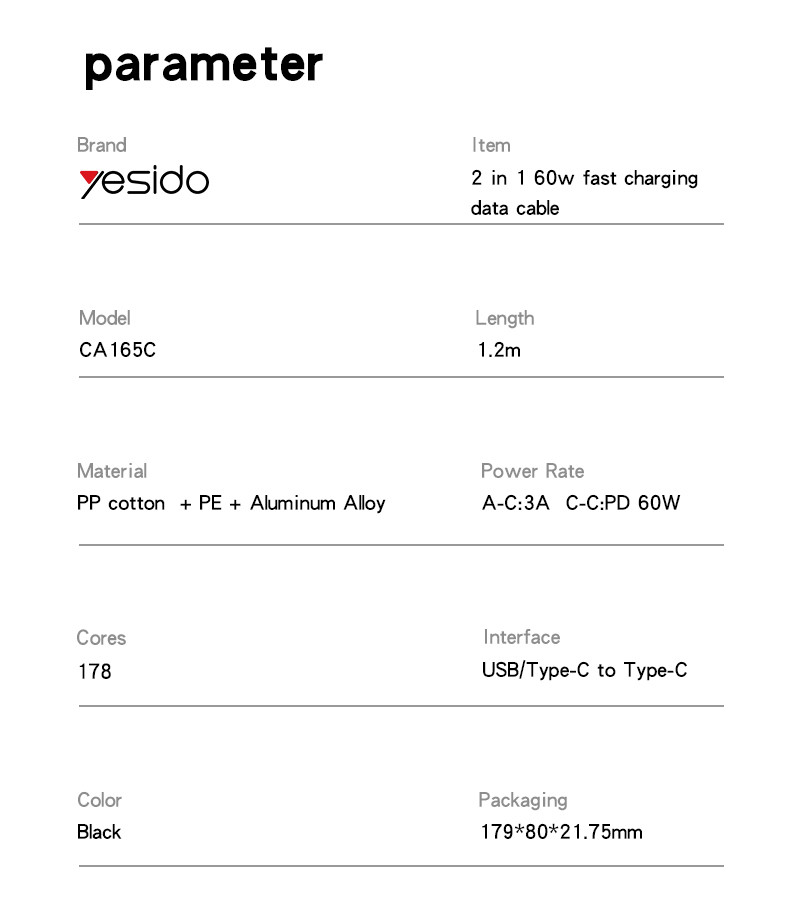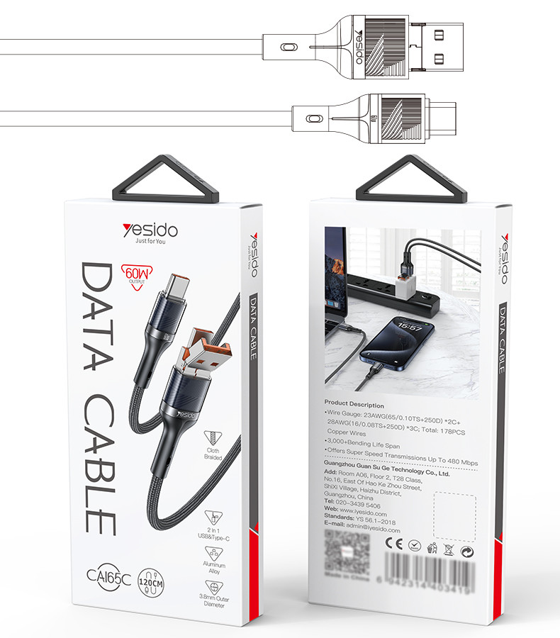 CA165C 60W USB/Type-C To Type-C Data CableCA165C Yesido 2 in 1 60W Fast Charging High-density Braided Body USB/Type-C To Type-C Data Cable.Support protocol of QC, PD, PPS, SCP, SVP, VOOC and so on.FeaturesOur Data Cable support max 60W charging.Data Cable is USB/Type-C to Type-C.It can charge the mobile phone, tablet, laptop and other devices.It supports charging and data transmit.Material: PP Braided Cable + TPE+ABS.Cable Core: 65/0.10TS*2C+250D+16/0.08TS*3C+250D, OD: 3.8mm.1.2 meters Long.Standard Max 60W/18W.CA165C 60W USB/Type-C To Type-C Data CableParameterBrand:YesidoItem Name:USB/Type-C to Type-C Data CableMode:CA165CApply to:mobile phone / tablet / laptop / othersMaterial:PP cotton + PE + Aluminum AlloyFeatures:Output:60W maxG.W:62GCA165C 60W USB/Type-C To Type-C Data CableParameterProduct CompositionUSB/Type-C to Type-C.1. Connect the cable to a wall charger / laptop2. Connect another type to devicesCA165C 60W USB/Type-C To Type-C Data CableDetailsFAQ1. what is the delivery time of theCA165C 60W USB/Type-C To Type-C Data Cable?Usually, the delivery time will be within 5-7 days.2. What you can do in OEMWe can help to design the customer’s logo on the products, and help to design the product packaging according to our standard3. How long is your warranty time?from the selling date, last for 1 year.