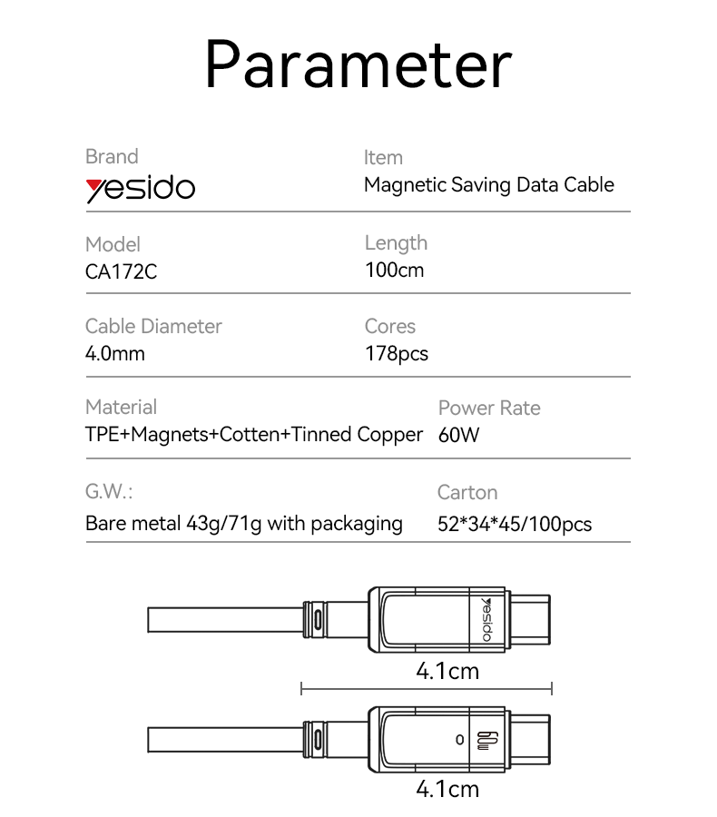 CA172C Type-C To Type-C 60W Magnetic Saving Data Cable Parameter