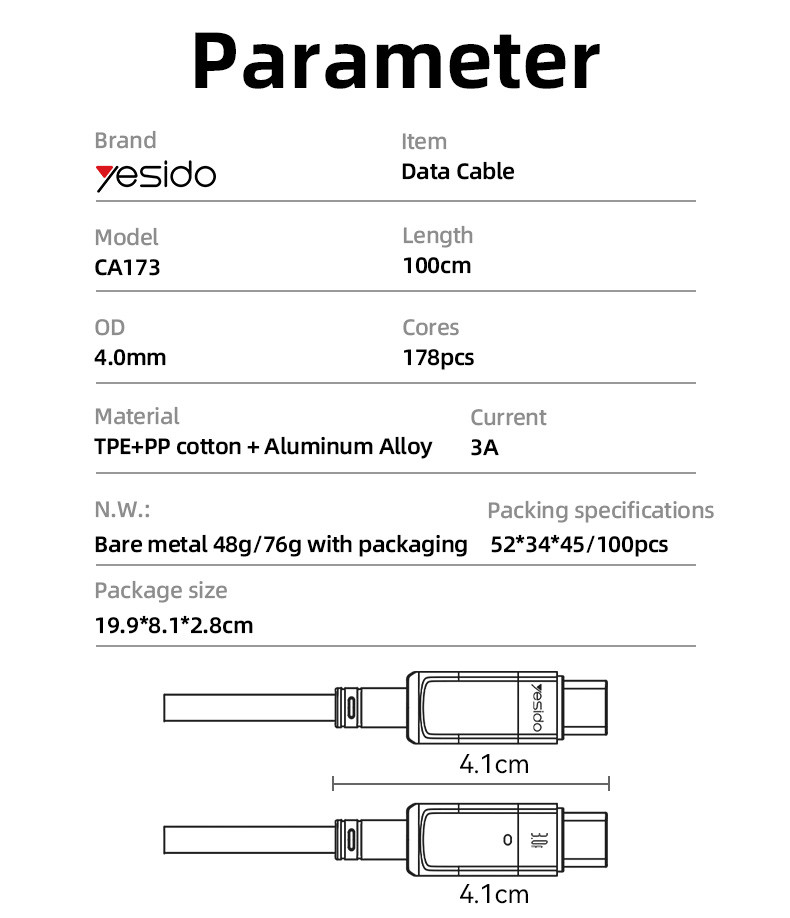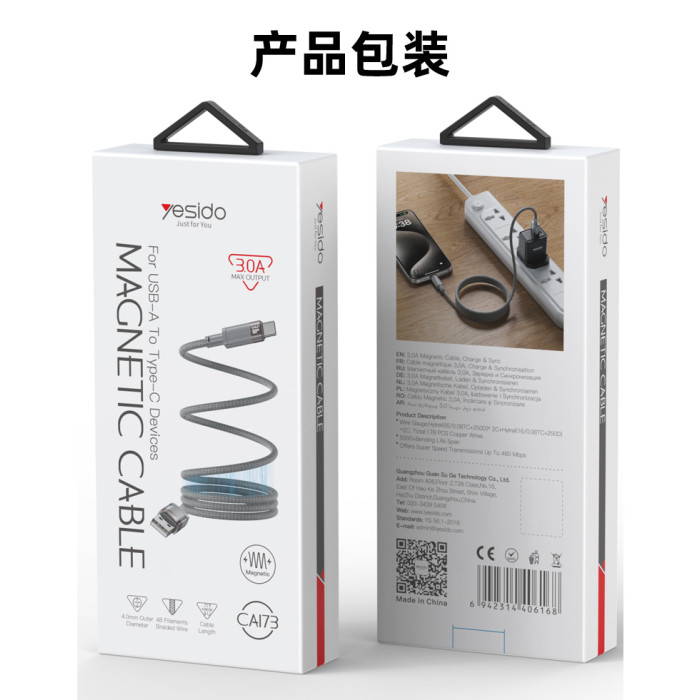 CA173 USB To TC 18W Magnetic Saving Data CableCA173 Yesido USB To Type-C 1 Meters Length Max 18W Fast Charging Magnetic Data Cable.Support protocol of QC, PD, PPS, SCP, SVP, VOOC and so on.FeaturesOur Data Cable support max 18W charging.Data Cable is USB to TC.It can charge the mobile phone, tablet, laptop and other devices.It supports charging and data transmit.Material: Cloth Braided Cable +TPE+Aluminum Alloy Shell .Cable Core: (65/0.08BC+250D)*2C+(16/0.08 BC+250D)*3C, OD: 4mm.1 meters Long.Standard Max 18W (5V-3A).CA173 USB To TC 18W Magnetic Saving Data CableParameterBrand:YesidoItem Name:USB to TC Data CableMode:CA173Apply to:mobile phone / tablet / laptop / othersMaterial:TPE+grey+black 48 spindle braided wireFeatures:Magnetic SavingOutput:18W maxG.W:75GCA173 USB To TC 18W Magnetic Saving Data Cable ParameterProduct CompositionUSB to Type-C Data Cable.1. Connect the cable to a wall charger / laptop2. Connect another type to devicesCA173 USB To TC 18W Magnetic Saving Data Cable DetailsFAQ1. what is the delivery time of theCA173 USB To TC 18W Magnetic Saving Data Cable?Usually, the delivery time will be within 5-7 days.2. What you can do in OEMWe can help to design the customer’s logo on the products, and help to design the product packaging according to our standard3. How long is your warranty time?from the selling date, last for 1 year.