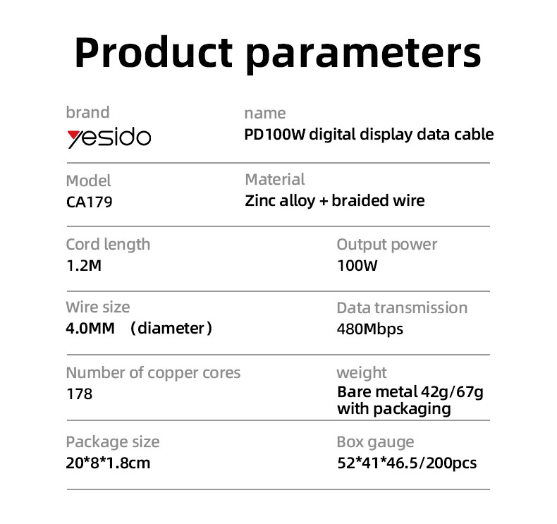 CA179 100W Type-C To Type-C Data CableCA179 Yesido 1.2 Meters Type-C To Type-C PD 100W Super Fast Charging Built-in Digital Display Data Cable.Support protocol of QC, PD, PPS, SCP, SVP, VOOC and so on.FeaturesOur Data Cable support max 100W fast charging.Data Cable is Type-C to Type-C.It can charge the mobile phone, tablet, laptop and other devices.It supports charging and data transmit.Material: Cloth Braided Cable +TPE+Zinc Alloy Shell.Cable Core: 65/0.10TC*2C+250D+16/0.08TC*3C+250D.1.2 meters Long.Standard Max 100W (20V-5A).CA179 100W Type-C To Type-C Data Cable ParameterBrand:YesidoItem Name:Type-C to Type-C 100W Data CableMode:CA179Apply to:mobile phone / tablet / laptop / othersMaterial:Nylon Braided cable + Aluminum AlloyFeatures:Built-in Digital DisplayOutput:100W maxG.W:68GCA179 100W Type-C To Type-C Data Cable ParameterProduct Composition1.2 meter data cables100WType-C to Type-C1. Connect the cable to a wall charger / laptop2. Connect another type to devicesCA179 100W Type-C To Type-C Data Cable DetailsFAQ1. what is the delivery time of the CA179 100W Type-C To Type-C Data Cable?Usually, the delivery time will be within 5-7 days.2. What you can do in OEMWe can help to design the customer’s logo on the products, and help to design the product packaging according to our standard3. How long is your warranty time?from the selling date, last for 1 year.