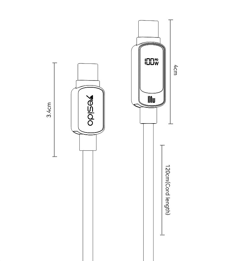CA179 Yesido 1.2 Meters Type-C To Type-C PD 100W Super Fast Charging Built-in Digital Display Data Cable.