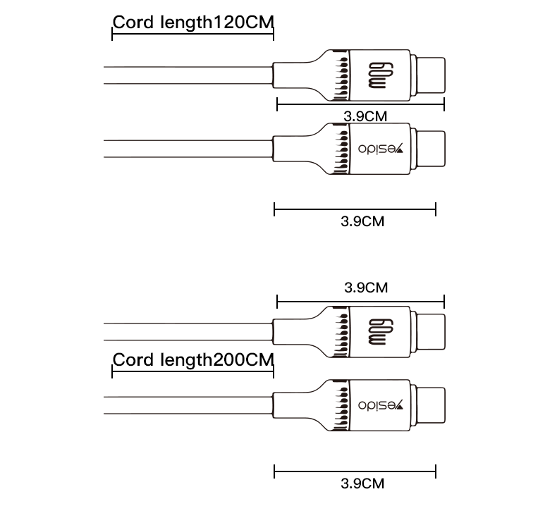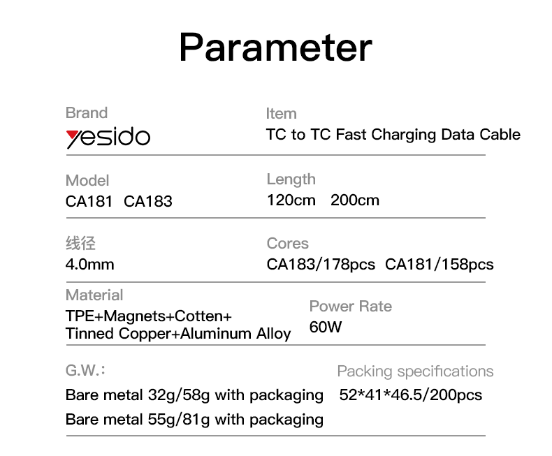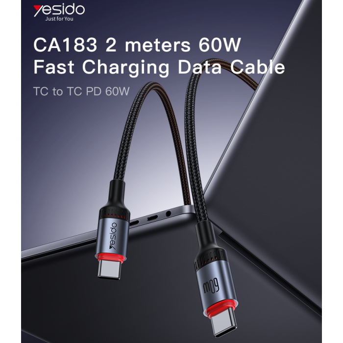 CA183 Type-C To Type-C 60W Fast Charging Data CableCA183 Yesido 2M PD60W Fast Charging Type-C To Type-C 48-Strand Braided Cable Power LED Light Data Cable.Support protocol of QC, PD, PPS, SCP, SVP, VOOC and so on.FeaturesOur Data Cable support max 60W charging.Data Cable is TC to TC.It can charge the mobile phone, tablet, laptop and other devices.It supports charging and data transmit.Material: Nylon Braided Cable +TPE+Aluminum Alloy.Cable Core: (55/0.1TC+250D)*2C+(16/0.08BC+250D)*3C, OD: 4.0mm.2 meters Long.Standard Max 60W.CA183 Type-C To Type-C 60W Fast Charging Data CableParameterBrand:YesidoItem Name:Type-C to TC Data CableMode:CA183Apply to:mobile phone / tablet / laptop / othersMaterial:Nylon Braided Cable +TPE+Aluminum AlloyFeatures:Output:60W maxG.W:80GCA183 Type-C To Type-C 60W Fast Charging Data Cable ParameterProduct CompositionCA183 Type-C To Type-C 60W Fast Charging Data Cable1. Connect the cable to a wall charger / laptop2. Connect another type to devicesCA183 Type-C To Type-C 60W Fast Charging Data Cable DetailsFAQ1. what is the delivery time of theCA183 Type-C To Type-C 60W Fast Charging Data Cable?Usually, the delivery time will be within 5-7 days.2. What you can do in OEMWe can help to design the customer’s logo on the products, and help to design the product packaging according to our standard3. How long is your warranty time?from the selling date, last for 1 year.