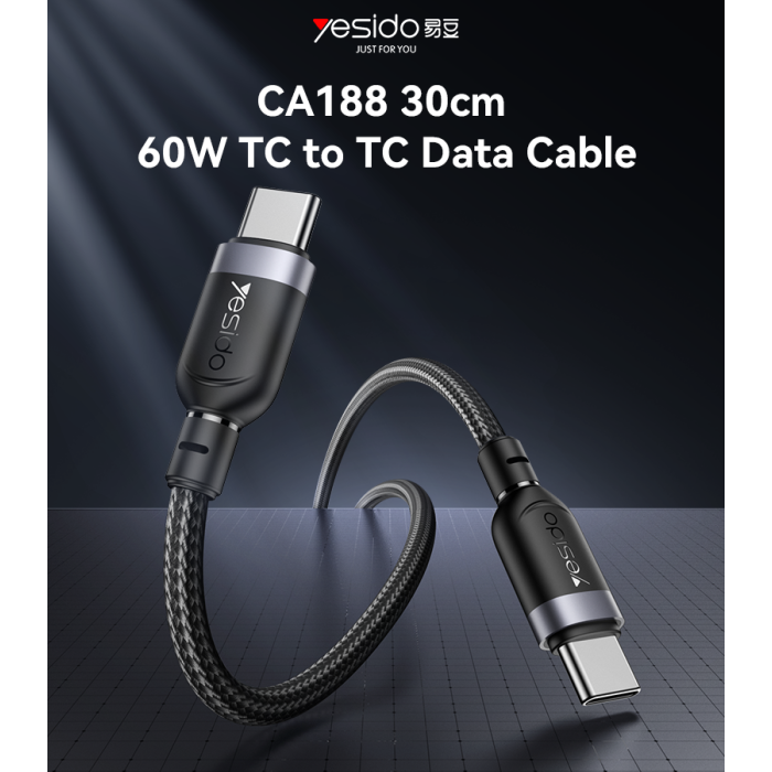 CA188 Yesido 30CM PD 60W Fast Charging Type-C To Type-C Max With 480Mbps Data Transfer Braided Data Cable.