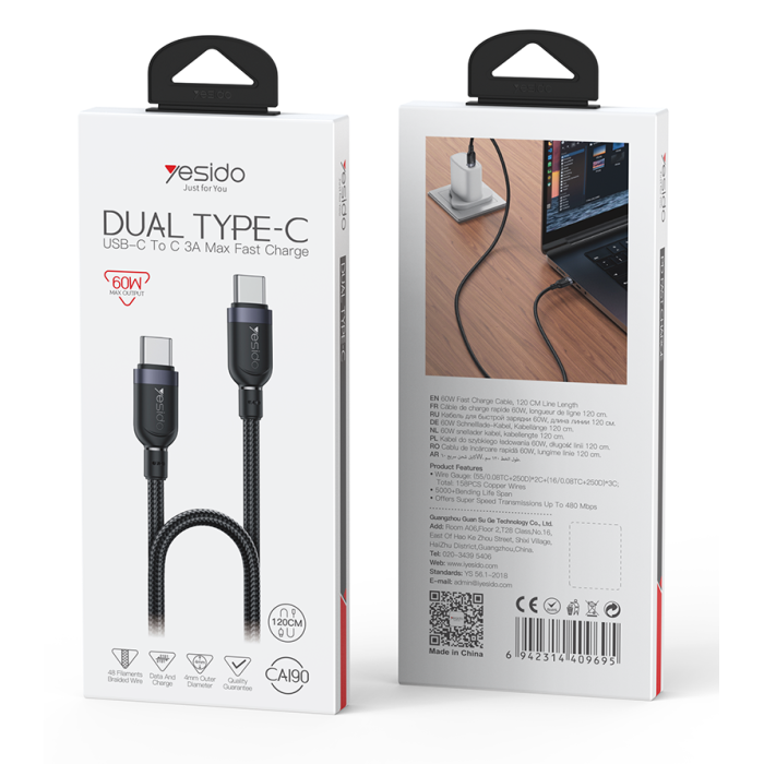 CA190 1.2M Type-C To Type-C 60W Fast Charging Data CableCA190 Yesido 1.2M PD 60W Fast Charging Type-C To Type-C Max With 480Mbps Data Transfer Braided Data Cable.Support protocol of QC, PD, PPS, SCP, SVP, VOOC and so on.FeaturesOur Data Cable support max 60W charging.Data Cable is TC to TC.It can charge the mobile phone, tablet, laptop and other devices.It supports charging and data transmit.Material: Nylon Braided Cable +TPE+Aluminum Alloy.Cable Core: (55/0.08TC+250D)*2C+(16/0.08 TC+250D)*3C, OD: 4.0mm.1.2 meters Long.Standard Max 60W.CA190 1.2M Type-C To Type-C 60W Fast Charging Data CableParameterBrand:YesidoItem Name:Type-C to Type-C Data CableMode:CA190Apply to:mobile phone / tablet / laptop / othersMaterial:Nylon Braided Cable +TPE+Aluminum AlloyFeatures:Output:60W maxG.W:56GCA190 1.2M Type-C To Type-C 60W Fast Charging Data Cable ParameterProduct CompositionCA190 1.2M Type-C To Type-C 60W Fast Charging Data Cable1. Connect the cable to a wall charger / laptop2. Connect another type to devicesCA190 1.2M Type-C To Type-C 60W Fast Charging Data Cable DetailsFAQ1. what is the delivery time of theCA190 1.2M Type-C To Type-C 60W Fast Charging Data Cable?Usually, the delivery time will be within 5-7 days.2. What you can do in OEMWe can help to design the customer’s logo on the products, and help to design the product packaging according to our standard3. How long is your warranty time?from the selling date, last for 1 year.