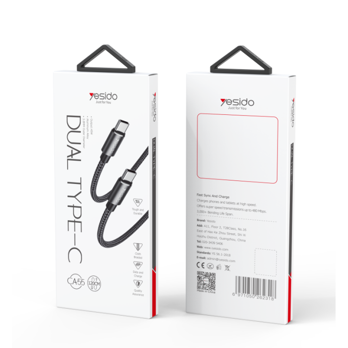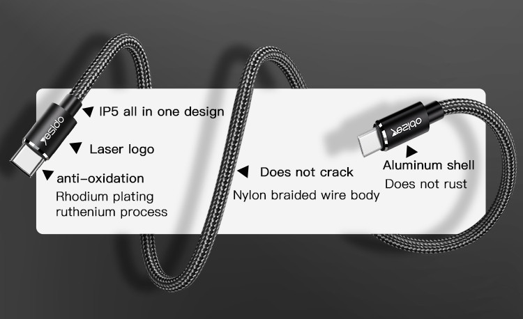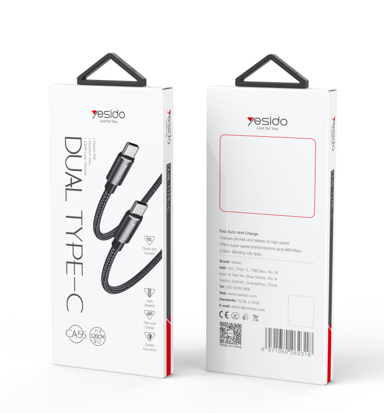 Short description: CA55 Type-C To Type-C Data CableCA55 Type-C To Type-C Nylon Braided Phone Charger Cable 45W 3A Fast Charging Mobile Data Cable.Support protocol of QC, PD, PPS, SCP, SVP, VOOC and so on.FeaturesData Cable isType-C To Type-C.It can charge the mobile phone, tablet, laptop and other devices.It supports chargingand data transmit.Nylon Braided + Aluminum Alloy.1.2 meter data cable.45W capacity.CA55 Type-C To Type-C Data CableParameterBrand:YesidoItem Name:Type-C To Type-C Data CableMode:CA55Apply to:mobile phone, tablet, laptop and other devicesMaterial:Nylon Braided+ Aluminum AlloyFeatures:Charging anddata transmitOutput:18WG.W:55GCA55 Type-C To Type-C Data CableVideoProduct Using Video1. Connect the cable to a wall charger / laptop2. Connect another type to devicesCA55 Type-C To Type-C Data CableDetailsFAQ1. what is the delivery time of the CA55 Type-C To Type-C Data Cable?Usually, the delivery time will be within 5-7 days.2. What you can do in OEM?We can help to design the customer’s logo on the products, and help to design the product packaging according to our standard3. How long is your warranty time?from the selling date, last for 1 year.