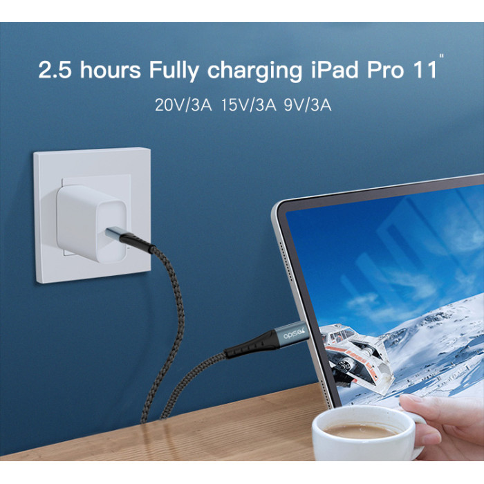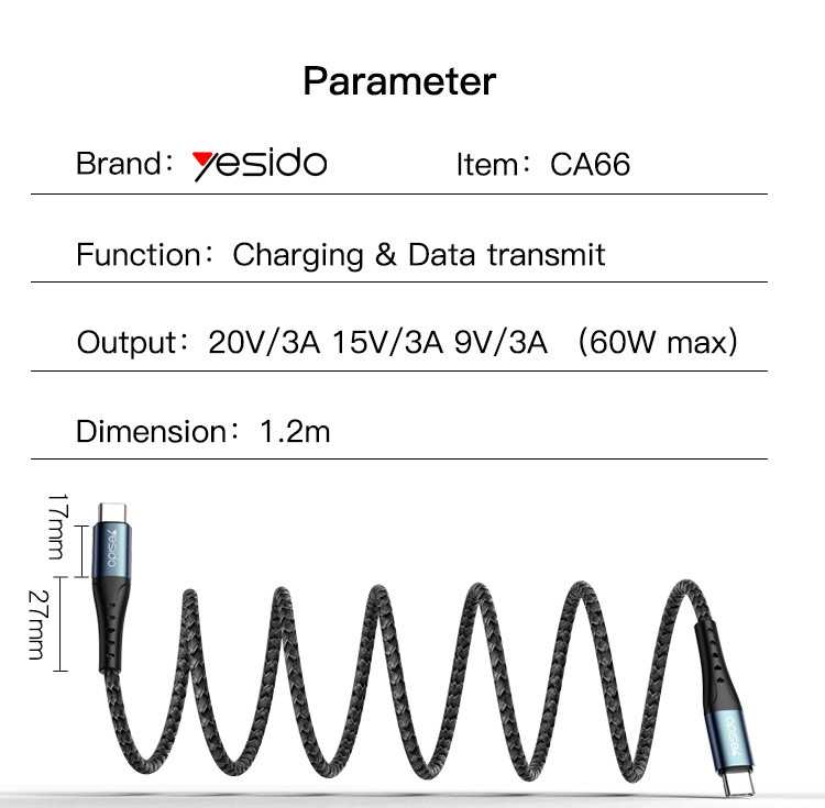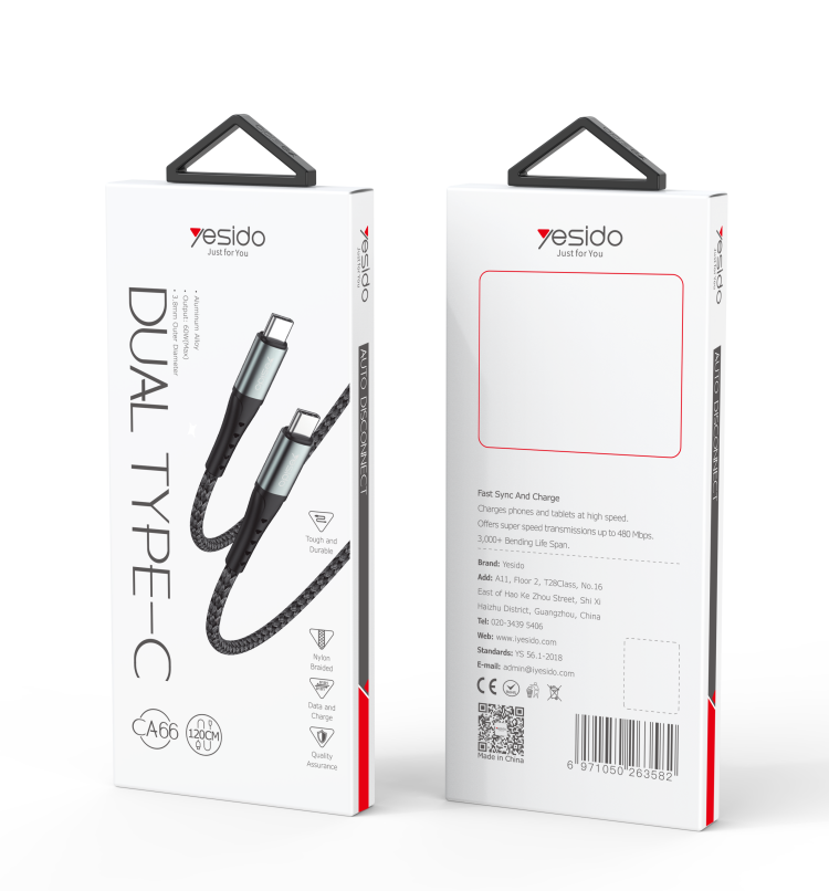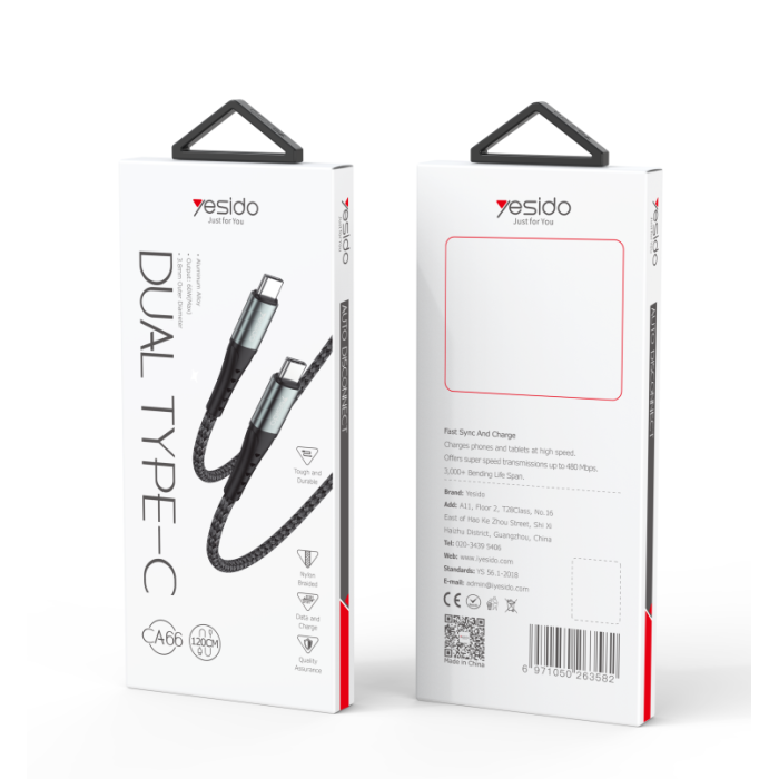 Short description: CA66 Type-C to Type-C Data CableCA66 Newest Arrival Type-C to Type-C Cable Computer Phone QC Charging Type-C Data Cable.Support protocol of QC, PD, PPS, SCP, SVP, VOOC and so on.FeaturesOur Data Cable support max 60W fast charging.Data Cable is Type-CTo Type-C.It can charge the mobile phone, tablet, laptop and other devices.It supports chargingand data transmit.Nylon cable + Aluminum Alloy.1.2M data cable.nylon cable.20V-3Amper.CA66 Type-C to Type-C Data CableParameterBrand:YesidoItem Name:Type-C to Type-C Data CableMode:CA66Apply to:mobile phone, tablet, laptop and other devicesMaterial:Nylon cable + Aluminum AlloyFeatures:Charging anddata transmitOutput:60W maxG.W:54GCA66 Type-C to Type-C Data CableVideoProduct Using Video1. Connect the cable to a wall charger / laptop2. Connect another type to devicesProduct CompositionType-C to Type-C Data Cable.CA66 Type-C to Type-C Data CableDetailsFAQ1. what is the delivery time of the CA66 Type-C to Type-C Data Cable?Usually, the delivery time will be within 5-7 days.2. What you can do in OEMWe can help to design the customer’s logo on the products, and help to design the product packaging according to our standard3. How long is your warranty time?from the selling date, last for 1 year.