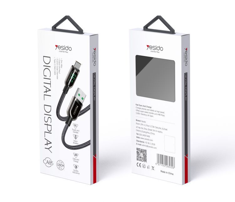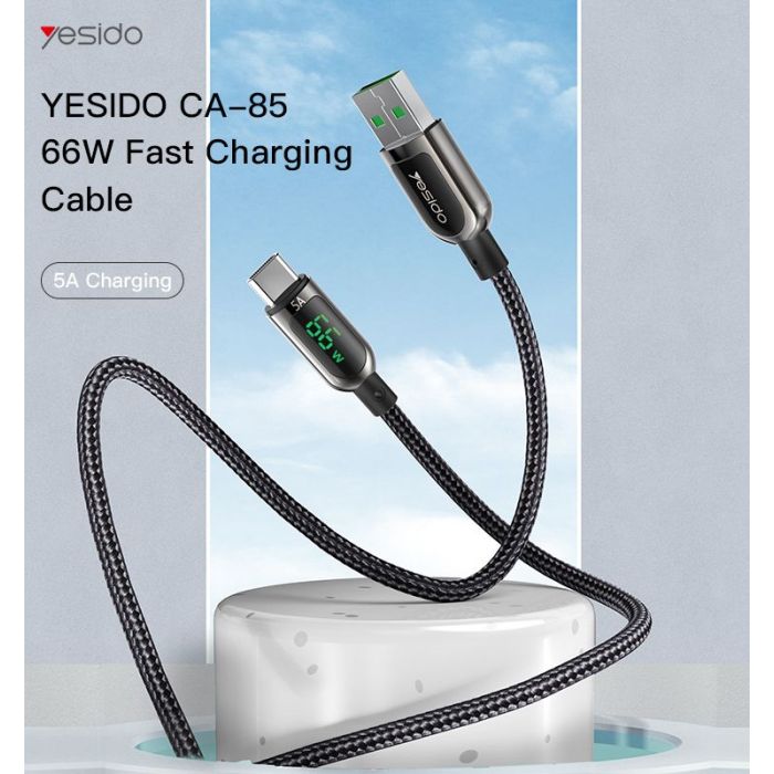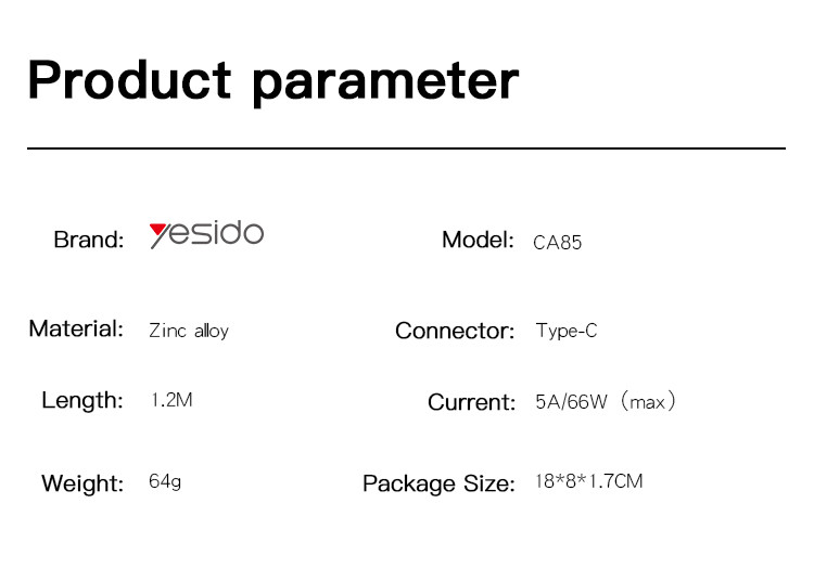CA85 USB to Type-C Data CableCA85 Zinc Alloy 5A Super Fast Charging USB Data Cable USB To Type-C Data Cable.Support protocol of QC, PD, PPS, SCP, SVP, VOOC and so on.FeaturesOur Data Cable support max 66W fast charging.Data Cable is USBTo Type-C.It can charge the mobile phone, tablet, laptop and other devices.It supports chargingand data transmit.Zinc Alloy + nylon braided cable.Show working status on types.1.2 meter data cable.Max 5Amper, Max 60W.CA85 USB to Type-C Data CableParameterBrand:YesidoItem Name:USB To Type-C Data CableMode:CA85Apply to:mobile phone / tablet / laptop / othersMaterial:Zinc Alloy + nylon braidedFeatures:Charging and data transmissionOutput:66W maxG.W:65GCA85 USB to Type-C Data CableVideoProduct Using Video1. Connect the cable to a wall charger / laptop2. Connect another type to devicesProduct CompositionUSB to Type-C.CA85 USB to Type-C Data CableDetailsFAQ1. what is the delivery time of the CA85 USB to Type-C Data Cable?Usually, the delivery time will be within 5-7 days.2. What you can do in OEMWe can help to design the customer’s logo on the products, and help to design the product packaging according to our standard3. How long is your warranty time?from the selling date, last for 1 year.