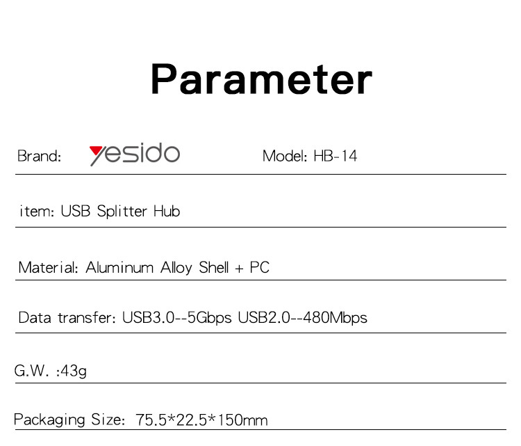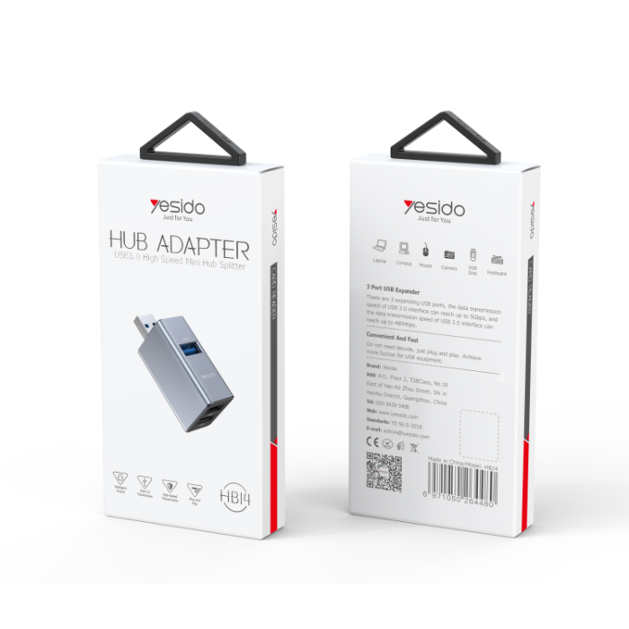 HB14 3 in 1 USB to 3 USB Hub AdapterUSB 3.0 + 2 USB2.0.HB14 Mini USB Hub | 3.0 USB Plug To 3 USB Ports Hub Adapter.Supportdevices to read data.Features3 in 1 design.USB Plug.USB splitter to 3USB.1USB with USB 3.0.2USB with USB 2.0.HB14 3 in 1 USB to 3 USB Hub Adapter ParameterBrand:YesidoItem Name:3 in 1 USB to 3 USB hubMode:HB14Apply to:mobile phone / tablet / laptop / othersMaterial:Aluminum Alloy + PCFeatures:Support Data and chargingOutput:G.W:44GHB14 3 in 1 USB to 3 USB Hub AdapterVideoProduct Using Video1. Insert the Hub to mobile phone/tablet / laptop2. Connect the USB Flash disk, external devices or charging cable to USB hubProduct Composition1 USB with USB 3.02 USB with USB 2.0HB14 3 in 1 USB to 3 USB Hub AdapterDetailsFAQ1. what is the delivery time of theHB14 3 in 1 USB to 3 USB Hub Adapter?Usually, the delivery time will be within 5-7 days.2. What you can do in OEM?We can help to design the customer’s logo on the products, and help to design the product packaging according to our standard3. How long is your warranty time?from the selling date, last for 1 year.