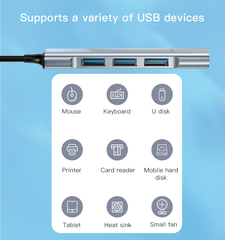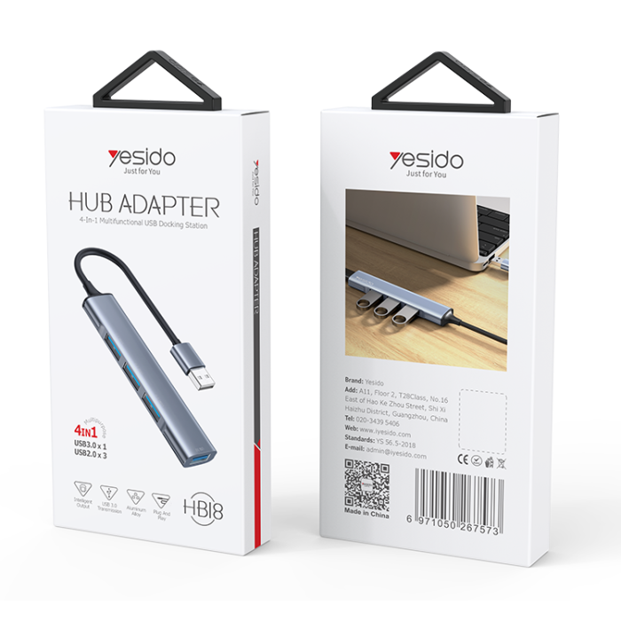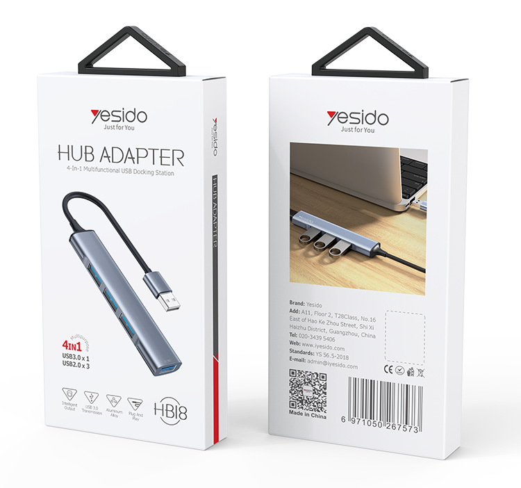 HB18 USB to USB and Charging USB Hub1*USB3.0 + 3*USB2.0.Multiport Dock Adapter Laptop Docking Station.Supportdevices to read data.FeaturesSupport Fast Data transfer: USB3.0 .Support HDMI2.0 video SplitterHB18 USB to USB and Charging USB HubParameterBrand:YesidoItem Name:USB hubMode:HB18Apply to:mobile phone / tablet / laptop / othersMaterial:Aluminum AlloyFeatures:Support Data and chargingOutput:According to devices, Max 100WG.W:48GHB18 USB to USB and Charging USB HubVideoProduct Using Video1. Insert the Hub to mobile phone/tablet / laptop2. Connect the USB Flash disk, external devices or charging cable to USB hubProduct CompositionHB18 USB to USB and Charging USB HubDetailsFAQ1. what is the delivery time of theHB18 USB to USB and Charging USB Hub?Usually, the delivery time will be within 5-7 days.2. What you can do in OEM?We can help to design the customer’s logo on the products, and help to design the product packaging according to our standard3. How long is your warranty time?from the selling date, last for 1 year.