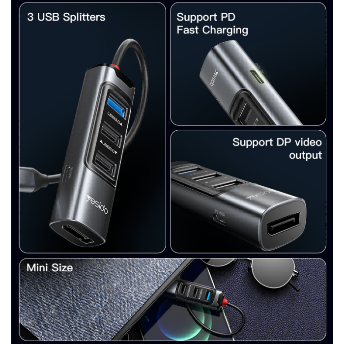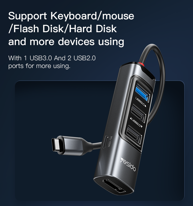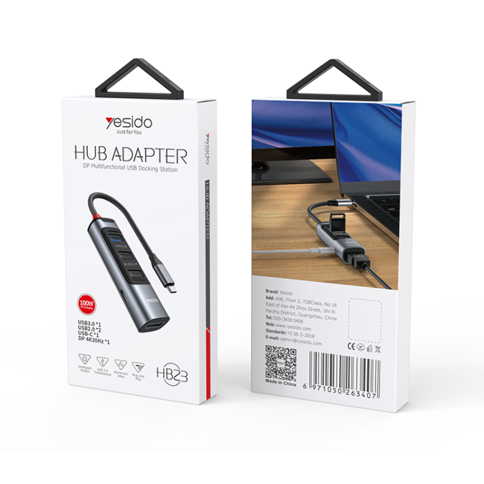 HB23 Type-C to USB and Charging USB Hub1*USB3.0 + 2*USB2.0 + 1*Type C + 1*DP.Support 100W fast charging to laptop/tablet/mobile phone.Supportdevices to read data.FeaturesSupport Fast Charging: Max 100W.Support Fast Data transfer: USB3.0 .Support HDMI2.0 video SplitterHB23 Type-C to USB and Charging USB HubParameterBrand:YesidoItem Name:Type-C USB hubMode:HB23Apply to:mobile phone / tablet / laptop / othersMaterial:Aluminum AlloyFeatures:Support Data and chargingOutput:According to devices, Max 100WG.W:60GHB23 Type-C to USB and Charging USB HubVideoProduct Using Video1. Insert the Hub to mobile phone/tablet / laptop2. Connect the USB Flash disk, external devices or charging cable to USB hubProduct CompositionHB23 Type-C to USB and Charging USB HubDetailsFAQ1. what is the delivery time of theHB23 Type-C to USB and Charging USB Hub?Usually, the delivery time will be within 5-7 days.2. What you can do in OEM?We can help to design the customer’s logo on the products, and help to design the product packaging according to our standard3. How long is your warranty time?from the selling date, last for 1 year.