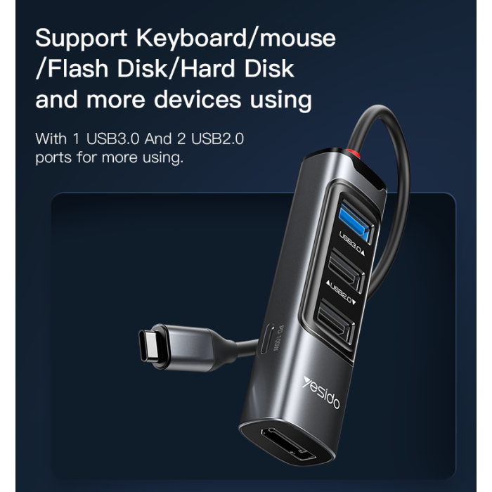 Short description: HB23 Type-C to USB and Charging USB Hub1*USB3.0 + 2*USB2.0 + 1*Type C + 1*DP.Support 100W fast charging to laptop/tablet/mobile phone.Supportdevices to read data.FeaturesSupport Fast Charging: Max 100W.Support Fast Data transfer: USB3.0 .Support HDMI2.0 video SplitterHB23 Type-C to USB and Charging USB HubParameterBrand:YesidoItem Name:Type-C USB hubMode:HB23Apply to:mobile phone / tablet / laptop / othersMaterial:Aluminum AlloyFeatures:Support Data and chargingOutput:According to devices, Max 100WG.W:60GHB23 Type-C to USB and Charging USB HubVideoProduct Using Video1. Insert the Hub to mobile phone/tablet / laptop2. Connect the USB Flash disk, external devices or charging cable to USB hubProduct CompositionHB23 Type-C to USB and Charging USB HubDetailsFAQ1. what is the delivery time of theHB23 Type-C to USB and Charging USB Hub?Usually, the delivery time will be within 5-7 days.2. What you can do in OEM?We can help to design the customer’s logo on the products, and help to design the product packaging according to our standard3. How long is your warranty time?from the selling date, last for 1 year.