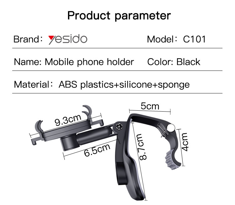 C101 Dashboard Spring Clip Phone HolderYesido C101 Rearview Mirror 360 Rotating Hand Abs Flexible Stand Clamp Dashboard Phone Holder For Car.HPS offer 0.5J/1J/2J/3.5J/4.8J(AC/AC&DC/SOLAR).FeaturesPlastic Spring Clip Holder.using on dashboard.Auto extended clamp arm on button.C101 Dashboard Spring Clip Phone HolderParameterBrand:YesidoFixing method:Spring Clip Phone HolderMode:C101Apply to:DashboardMaterial:ABS plastics+silicone+spongeApplicable items:Mobile PhoneOutput:G.W:167GC101 Dashboard Spring Clip Phone HolderVideoProduct Installation Video1.Assemble the holder and the base.2.Assemble the holder on to the dashboard.3. Put the mobile phone on and start using.Product CompositionSpring Clip Phone Holder.C101 Dashboard Spring Clip Phone HolderDetailsFAQ1. what is the delivery time of theC101 Dashboard Spring Clip Phone Holder?Usually, the delivery time will be within 5-7 days.2. What you can do in OEM ?We can help to design the customer’s logo on the products, and help to design the product packaging according to our standard3. How long is your warranty time?from the selling date, last for 1 year.