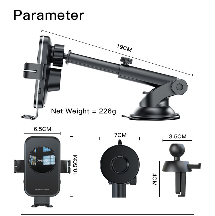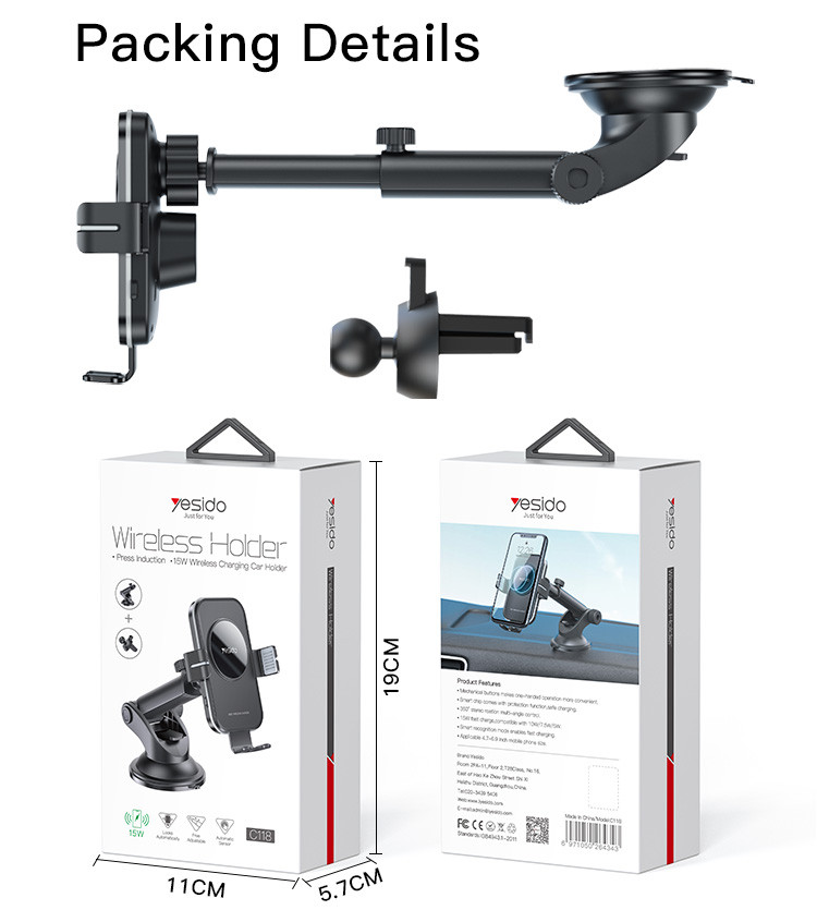 15W Auto Sensor Closing Clip Wireless Charger Holder15W Qi Fast Wireless Charger provides intelligent and quick charging for multiple Qi-enabled devices. It requires a QC 3.0 Car ChargerHPS offer 0.5J/1J/2J/3.5J/4.8J(AC/AC&DC/SOLAR).FeaturesOur phone car mount offers intelligent identification and smart charging.phone holder allows hassle-free charging through cases up to 6mm thick.It offers a 360° rotating sphere and a retractable & foldable bracket for optimal viewing and safe driving.2-In-1 design ensures a secure, hands-free experience and is compatible with car windshields, dashboards, and air vents15W Auto Sensor Closing Clip Wireless Charger HolderParameterBrand:YesidoFixing method:Suction cup+clipMode:C118Apply to:Dashboard/ air ventMaterial:Abs+pc+tpuApplicable items:Wireless charging functionOutput:15WmaxG.W:250G15W Auto Sensor Closing Clip Wireless Charger HolderVideoProduct Installation Video1. Assemble the holder and the suction cup base2. Release the suction cup and peel of the layer3. Press the suction cup on to car dashboard / windshield4. Close the Suction Cup Button and leave it alone for around 6~8 hours5. Connect the cable to the holder and car charger6. Touch the switch on the back to open the clip7. put the mobile phone on and start usingProduct CompositionHolder HeadSucntion Cup Base+ Air vent Clip15W Auto Sensor Closing Clip Wireless Charger HolderDetailsFAQ1. what is the delivery time of the15W Auto Sensor Closing Clip Wireless Charger Holder?Usually, the delivery time will be within 5-7 days.2. What you can do in OEMWe can help to design the customer’s logo on the products, and help to design the product packaging according to our standard3. How long is your warranty time?from the selling date, last for 1 year.