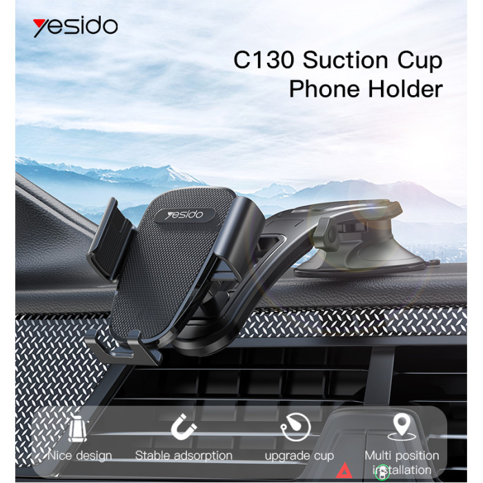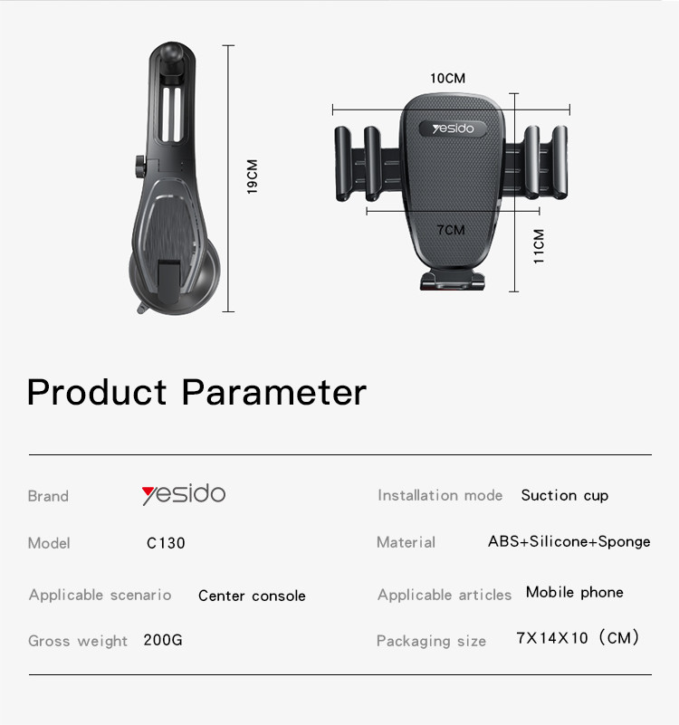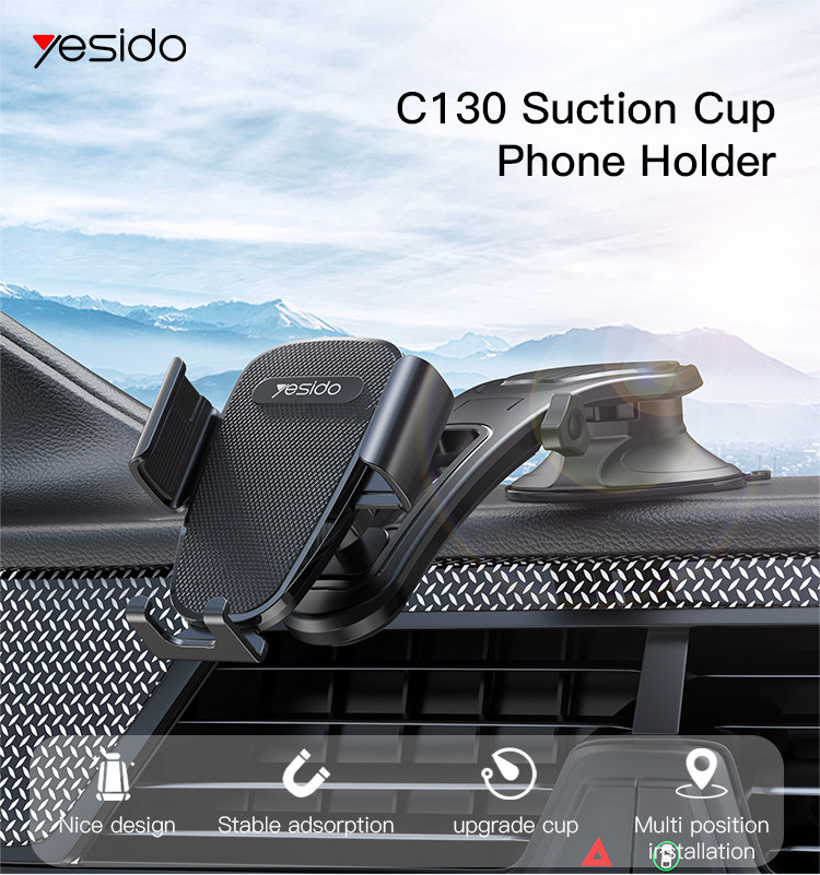 C130 Suction Cup Phone HolderYesido C130 Plastic Car Dashboard Suction Cup Using Flexible Adjustment Moblie Phone Holder..HPS offer 0.5J/1J/2J/3.5J/4.8J(AC/AC&DC/SOLAR).FeaturesMainly ABS material.Spring Clip Holder.Folding Clamp Arm.For Dashboard / windshild.C130 Suction Cup Phone HolderParameterBrand:YesidoFixing method:Suction Cup Spring Clip Phone HolderMode:C130Apply to:Air outletMaterial:ABS+Silicone+SpongeApplicable items:Mobile PhoneOutput:G.W:194GC130 Suction Cup Phone HolderVideoProduct Installation Video1.Assemble the holder and the base.2.Assemble the holder on to theDashboard or windshild.3. put the mobile phone on and start using.Product CompositionSuction Cup Spring Clip Phone HolderC130 Suction Cup Phone HolderDetailsFAQ1. what is the delivery time of theC130 Suction Cup Phone Holder?Usually, the delivery time will be within 5-7 days.2. What you can do in OEM ?We can help to design the customer’s logo on the products, and help to design the product packaging according to our standard3. How long is your warranty time?from the selling date, last for 1 year.