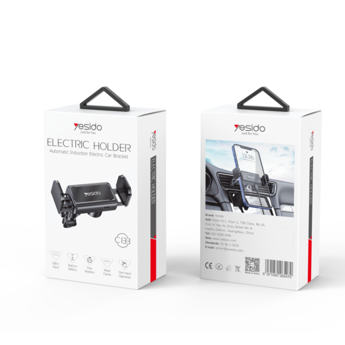 C133 Air Vent Phone HolderYesido C133 New design electronic clamp arm smart one button control for car mobile phone..HPS offer 0.5J/1J/2J/3.5J/4.8J(AC/AC&DC/SOLAR).FeaturesElectricitic controling Aimfor Airvent design.with button Switch on backType-C connection.C133 Air Vent Phone HolderParameterBrand:YesidoFixing method:Air Vent Spring Clip Phone HolderMode:C133Apply to:Air vent outletMaterial:ABS+Aluminum AlloyApplicable items:Mobile PhoneOutput:G.W:166GC133 Air Vent Phone HolderVideoProduct Installation Video1.Assemble the holder and the base.2.Assemble the holder on to theAir vent outlet.3. put the mobile phone on and start using.C133 Air Vent Phone HolderDetailsFAQ1. what is the delivery time of theC133 Air Vent Phone Holder?Usually, the delivery time will be within 5-7 days.2. What you can do in OEM ?We can help to design the customer’s logo on the products, and help to design the product packaging according to our standard3. How long is your warranty time?from the selling date, last for 1 year.
