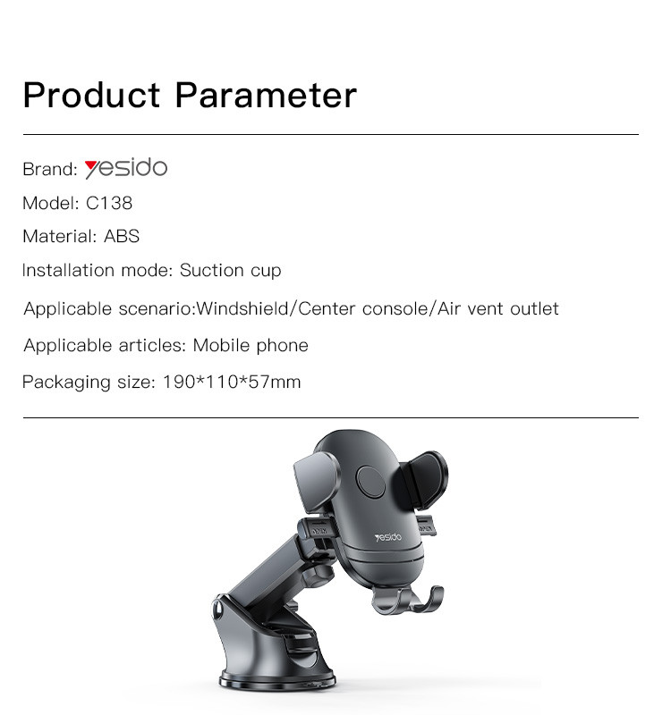 C138 Spring Clip Phone HolderYesido C138 Universal Flexible Dash Dashboard Suction Cup Clamp Phone Holder For Car..HPS offer 0.5J/1J/2J/3.5J/4.8J(AC/AC&DC/SOLAR).FeaturesTelescopic clamp arm.ABS + Aluminum Alloy.extending clip by switchauto close by button.Dashboard /windshield use.C138 Spring Clip Phone HolderParameterBrand:YesidoFixing method:Spring Clip Phone HolderMode:C138Apply to:Windshield/Center console/Air vent outletMaterial:ABS+Aluminum AlloyApplicable items:Mobile PhoneOutput:G.W:203GC138 Spring Clip Phone HolderVideoProduct Installation Video1.Assemble the holder and the base.2.Assemble the holder on to theBehindWindshield/Center console/Air vent outlet.3. put the mobile phone on and start using.Product CompositionSpring Clip Phone HolderC138 Spring Clip Phone HolderDetailsFAQ1. what is the delivery time of theC138 Spring Clip Phone Holder?Usually, the delivery time will be within 5-7 days.2. What you can do in OEM ?We can help to design the customer’s logo on the products, and help to design the product packaging according to our standard3. How long is your warranty time?from the selling date, last for 1 year.