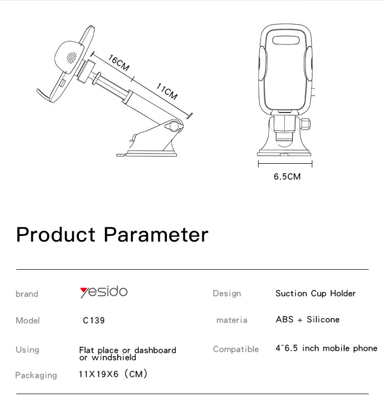 C139 Spring Clip Phone HolderYesido C140 Hot mobile phone accessories car holder 360 extend 360 suction car mount phone holder..HPS offer 0.5J/1J/2J/3.5J/4.8J(AC/AC&DC/SOLAR).FeaturesTelescopic clamp arm.ABS + Aluminum Alloy.auto extending clip by button.Dashboard /windshield useC139 Spring Clip Phone HolderParameterBrand:YesidoFixing method:Spring Clip Phone HolderMode:C139Apply to:Flat place or dashboard or windshieldMaterial:ABS + SiliconeApplicable items:Mobile PhoneOutput:G.W:214GC139 Spring Clip Phone HolderVideoProduct Installation Video1.Assemble the holder and the base.2.Assemble the holder on to theBehind flat place orcardashboard orcarwindshield.3. put the mobile phone on and start using.Product CompositionSpring Clip Phone HolderC139 Spring Clip Phone HolderDetailsFAQ1. what is the delivery time of theC139 Spring Clip Phone Holder?Usually, the delivery time will be within 5-7 days.2. What you can do in OEM ?We can help to design the customer’s logo on the products, and help to design the product packaging according to our standard3. How long is your warranty time?from the selling date, last for 1 year.