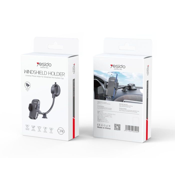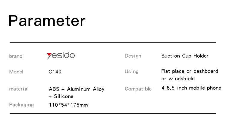 C140 Spring Clip Phone HolderYesido C140 360 Degree Rotating Arm Dashboard Truck Mobile Cellphone Smartphone Cell Smart Phone Holder Mount Bracket Stand Support For Car..HPS offer 0.5J/1J/2J/3.5J/4.8J(AC/AC&DC/SOLAR).Features20cm Flexible Clamp Arm.ABS + Aluminum Alloy.Auto extending clip by button.Dashboard /windshield useC140 Spring Clip Phone HolderParameterBrand:YesidoFixing method:Spring Clip Phone HolderMode:C140Apply to:Flat place or dashboard or windshieldMaterial:ABS + Aluminum Alloy+ SiliconeApplicable items:Mobile PhoneOutput:G.W:226GC140 Spring Clip Phone HolderVideoProduct Installation Video1.Assemble the holder and the base.2.Assemble the holder on to theBehind flat place orcardashboard orcarwindshield.3. put the mobile phone on and start using.Product CompositionSpring Clip Phone HolderC140 Spring Clip Phone HolderDetailsFAQ1. what is the delivery time of theC140 Spring Clip Phone Holder?Usually, the delivery time will be within 5-7 days.2. What you can do in OEM ?We can help to design the customer’s logo on the products, and help to design the product packaging according to our standard3. How long is your warranty time?from the selling date, last for 1 year.