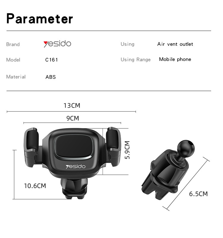 C161 Air Vent Memoried Clip Phone HolderYesido C161 Car Air Vent Phone Holder Car Cell Phone Mount Cradle with Adjustable Clip.HPS offer 0.5J/1J/2J/3.5J/4.8J(AC/AC&DC/SOLAR).FeaturesAir Vent using.ABS + PC + Silicone.Memory the using , can repeatly using withou adjustment to one phone.C161 Air Vent Memoried Clip Phone HolderParameterBrand:YesidoFixing method:Phone HolderMode:C161Apply to:Air outletMaterial:ABS + PC + SiliconeApplicable items:Mobile PhoneOutput:G.W:119GC161 Air Vent Memoried Clip Phone HolderVideoProduct Installation Video1. Assemble the holder.2. Assemble the holder on to the air outlet.3. put the mobile phone on and start using.Product CompositionSpring Clip Phone HolderC161 Air Vent Memoried Clip Phone HolderDetailsFAQ1. what is the delivery time of theC161 Air Vent Memoried Clip Phone Holder?Usually, the delivery time will be within 5-7 days.2. What you can do in OEM ?We can help to design the customer’s logo on the products, and help to design the product packaging according to our standard3. How long is your warranty time?from the selling date, last for 1 year.