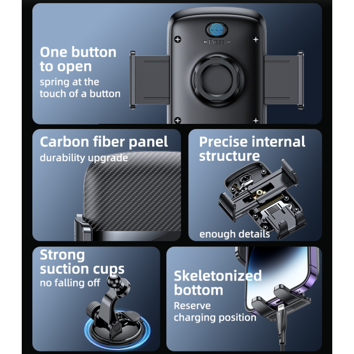 Short description: C175 Mini Base Suction Cup Phone HolderC175 Yesido One-touch Opening 360 Adjustable Viewing Angle Mini Suction Cup Ejector Clip Phone Holder.HPS offer 0.5J/1J/2J/3.5J/4.8J(AC/AC&DC/SOLAR).FeaturesPrivate mold.made from ABS+PC +Metal.Auto extending clip by switch button.360 degree rotating.Mini Base with suction cup.C175 Mini Base Suction Cup Phone Holder ParameterBrand:YesidoProduct Name:Adjustable Angle Mini suction Cup Ejectorclip HolderMode:C175Apply to:For Car center console/center screen/Instrument PanelMaterial:ABS+Carbon Fiber PanelApplicable items:4.7-7.2 inch molie phoneOutput:G.W:178GC312 Auto Alignment Wireless Charging Phone Holder ParameterProduct CompositionSpring ClipSuction cup1. Press the holder on to Car center console/center screen/Instrument Panel.2. put the mobile phone on and start using.C175 Mini Base Suction Cup Phone Holder DetailsFAQ1. what is the delivery time of the C175 Mini Base Suction Cup Phone Holder?Usually, the delivery time will be within 5-7 days.2. What you can do in OEMWe can help to design the customer’s logo on the products, and help to design the product packaging according to our standard3. How long is your warranty time?from the selling date, last for 1 year.