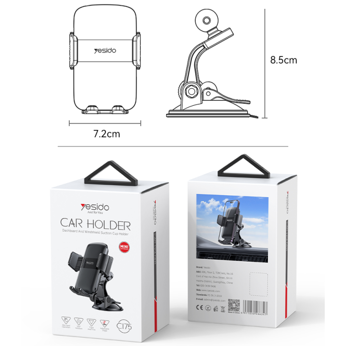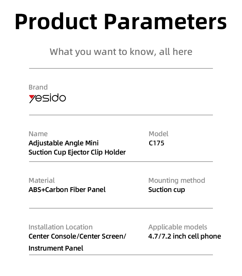 C175 Mini Base Suction Cup Phone HolderC175 Yesido One-touch Opening 360 Adjustable Viewing Angle Mini Suction Cup Ejector Clip Phone Holder.HPS offer 0.5J/1J/2J/3.5J/4.8J(AC/AC&DC/SOLAR).FeaturesPrivate mold.made from ABS+PC +Metal.Auto extending clip by switch button.360 degree rotating.Mini Base with suction cup.C175 Mini Base Suction Cup Phone Holder ParameterBrand:YesidoProduct Name:Adjustable Angle Mini suction Cup Ejectorclip HolderMode:C175Apply to:For Car center console/center screen/Instrument PanelMaterial:ABS+Carbon Fiber PanelApplicable items:4.7-7.2 inch molie phoneOutput:G.W:178GC312 Auto Alignment Wireless Charging Phone Holder ParameterProduct CompositionSpring ClipSuction cup1. Press the holder on to Car center console/center screen/Instrument Panel.2. put the mobile phone on and start using.C175 Mini Base Suction Cup Phone Holder DetailsFAQ1. what is the delivery time of the C175 Mini Base Suction Cup Phone Holder?Usually, the delivery time will be within 5-7 days.2. What you can do in OEMWe can help to design the customer’s logo on the products, and help to design the product packaging according to our standard3. How long is your warranty time?from the selling date, last for 1 year.