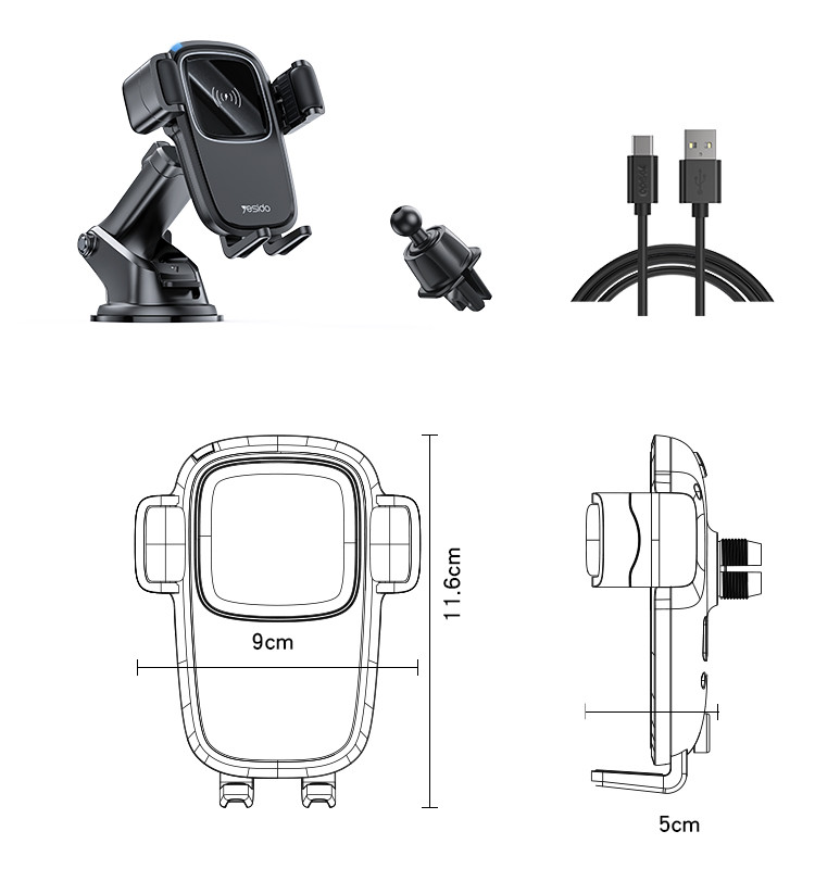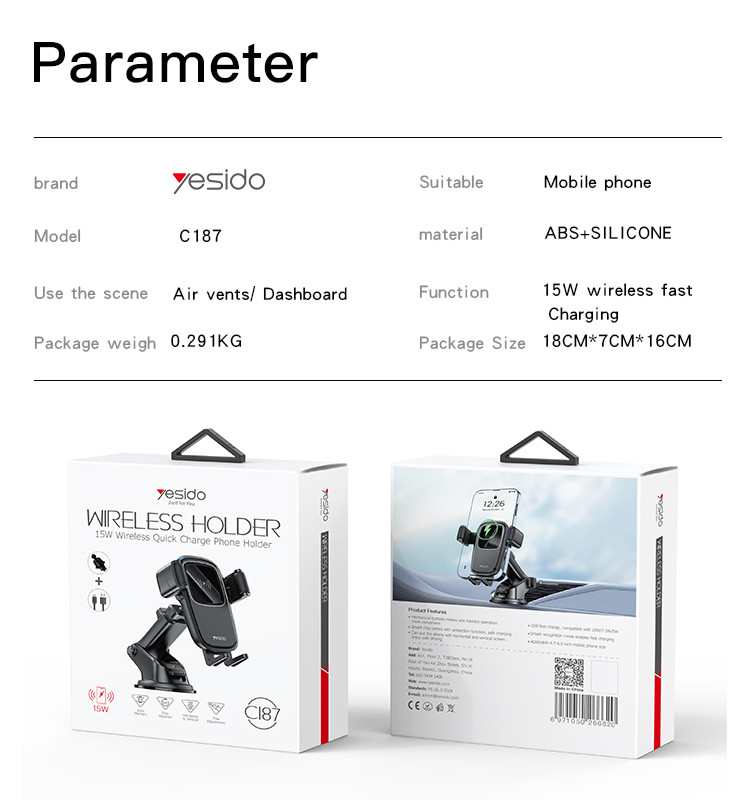 15W Memoriable Clip  Fast charging Wireless Charger15W Qi Fast Wireless Charger provides intelligent and quick charging for multiple Qi-enabled devices. It requires a QC 3.0 Car ChargerHPS offer 0.5J/1J/2J/3.5J/4.8J(AC/AC&DC/SOLAR).FeaturesOur phone car mount offers intelligent identification and smart charging.phone holder allows hassle-free charging through cases up to 6mm thick.It offers a 360° rotating sphere and a retractable & foldable bracket for optimal viewing and safe driving.2-In-1 design ensures a secure, hands-free experience and is compatible with car windshields, dashboards, and air vents15W Fast Wireless Charger ParameterBrand:YesidoFixing method:Suction cup+clipMode:C187Apply to:Dashboard/ air ventMaterial:Abs+PC + SiliconeApplicable items:Wireless charging functionOutput:15WmaxG.W:291G15W Fast Wireless Charger VideoProduct Installation Video1. Assemble the holder and the suction cup base2. Release the suction cup and peel of the layer3. Press the suction cup on to car dashboard / windshield4. Close the Suction Cup Button and leave it alone for around 6~8 hours5. Connect the cable to the holder and car charger6. Press the switch to extend the clip7. put the mobile phone on and clost the clip by handProduct CompositionHolder HeadSucntion Cup Base15W Fast Wireless Charger DetailsFAQ1. what is the delivery time of the C187 15W Wireless Charging Phone Holder?Usually, the delivery time will be within 5-7 days.2. What you can do in OEMWe can help to design the customer’s logo on the products, and help to design the product packaging according to our standard3. How long is your warranty time?from the selling date, last for 1 year.