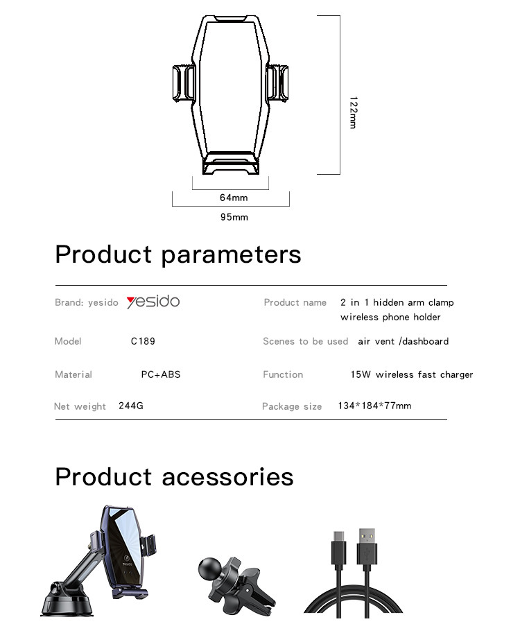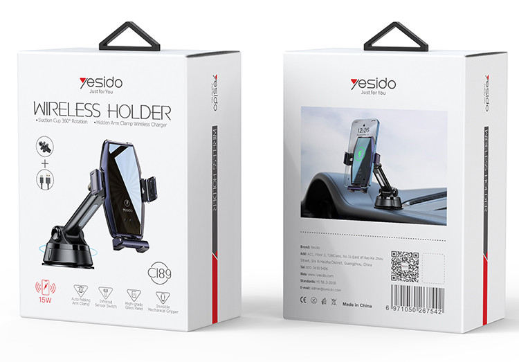 15W Auto Extending Wireless Charger15W Qi Fast Wireless Charger provides intelligent and quick charging for multiple Qi-enabled devices. It requires a QC 3.0 Car ChargerHPS offer 0.5J/1J/2J/3.5J/4.8J(AC/AC&DC/SOLAR).FeaturesOur phone car mount offers intelligent identification and smart charging.phone holder allows hassle-free charging through cases up to 6mm thick.It offers a 360° rotating sphere and a retractable & foldable bracket for optimal viewing and safe driving.2-In-1 design ensures a secure, hands-free experience and is compatible with car windshields, dashboards, and air vents15W Fast Wireless Charger ParameterBrand:YesidoFixing method:Suction cup+clipMode:C189Apply to:Dashboard/ air ventMaterial:Abs+pc+tpuApplicable items:Wireless charging functionOutput:15WmaxG.W:195G15W Fast Wireless Charger VideoProduct Installation Video1. Assemble the holder and the suction cup base2. Release the suction cup and peel of the layer3. Press the suction cup on to car dashboard / windshield4. Close the Suction Cup Button and leave it alone for around 6~8 hours5. Connect the cable to the holder and car charger6. Touch the switch on the back to open the clip7. put the mobile phone on and start usingProduct CompositionHolder HeadSucntion Cup Base15W Fast Wireless Charger DetailsFAQ1. what is the delivery time of the C189 15W Wireless Charging Phone Holder?Usually, the delivery time will be within 5-7 days.2. What you can do in OEMWe can help to design the customer’s logo on the products, and help to design the product packaging according to our standard3. How long is your warranty time?from the selling date, last for 1 year.