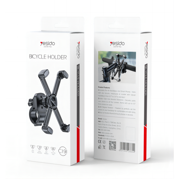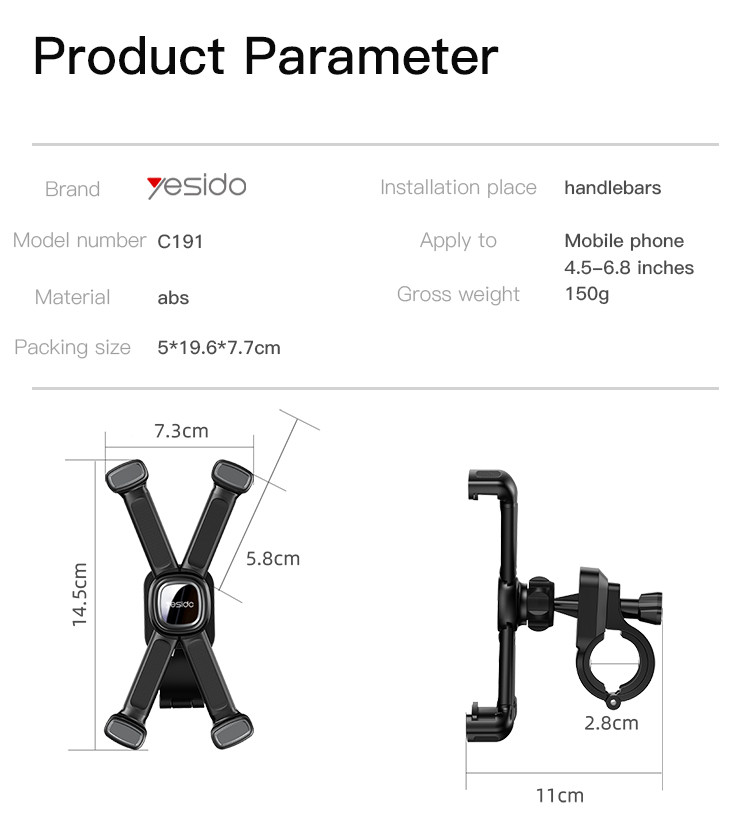C191 Bicycle/Motocycle phone holderYesido C191 Adjustable Phone Holder Stand Universal Motorcycle Bicycle Bike Handlebar Bracket Mount Clip GPS Phone Holder.HPS offer 0.5J/1J/2J/3.5J/4.8J(AC/AC&DC/SOLAR).FeaturesABS+Metal+PC.4 Corner Holding mobile.for bicycle/motocycle.C191 Bicycle/Motocycle phone holderParameterBrand:YesidoFixing method:ClipMode:C191Apply to:Bicycle/Motocycle handlebarsMaterial:ABSApplicable items:All kinds of mobile phoneOutput:G.W:155GC191 Bicycle/Motocycle phone holderVideoProduct Installation Video1. Assemble the holder.2. Press the holder on to Bicycle/Motocycle handlebars.3.open the clip4. put the mobile phone on and start usingProduct CompositionHolder HeadClipC191 Bicycle/Motocycle phone holderDetailsFAQ1. what is the delivery time of theC191 Bicycle/Motocycle phone holder?Usually, the delivery time will be within 5-7 days.2. What you can do in OEMWe can help to design the customer’s logo on the products, and help to design the product packaging according to our standard3. How long is your warranty time?from the selling date, last for 1 year.
