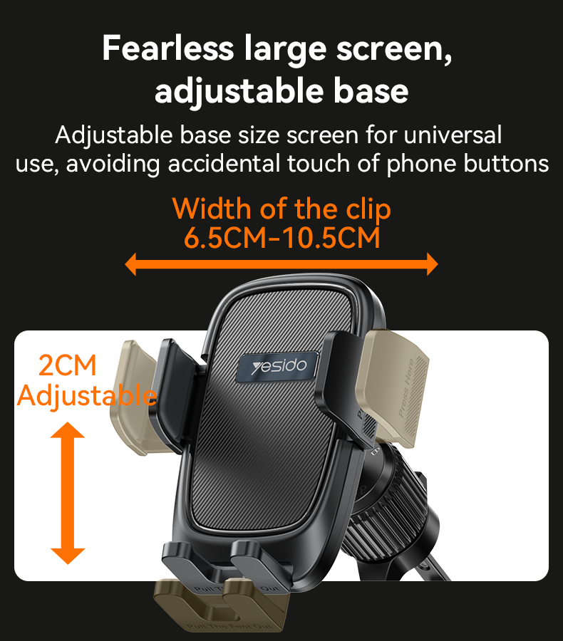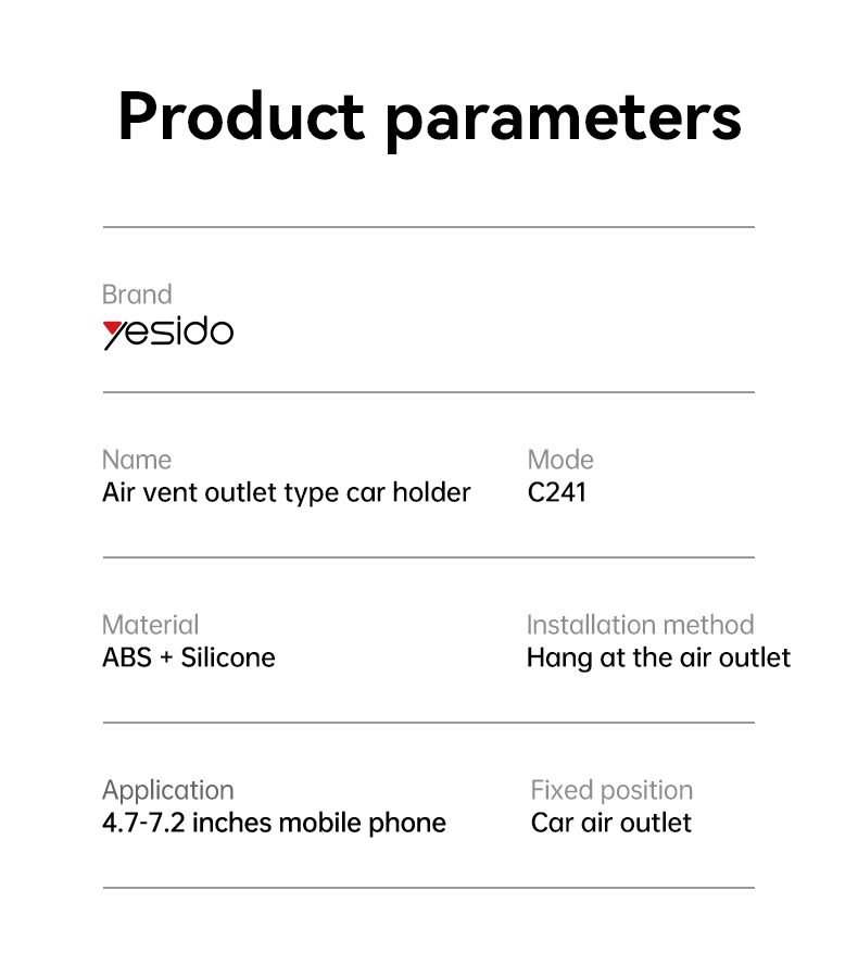 C241 Air Vent Spring Clip Phone HolderYesido C241 Car Vent Cell Phone Holder Car Hands Free Cradle in Vehicle Car Phone Holder MountHPS offer 0.5J/1J/2J/3.5J/4.8J(AC/AC&DC/SOLAR).FeaturesPrivate Mold.Goose Silicone Anti-slip.universal for all mobile phone.Auto extended clip.For Air vent Using (Eagle hook).C241 Air Vent Spring Clip Phone HolderParameterBrand:YesidoFixing method:Suction cup+clipMode:C241Apply to:Air ventMaterial:ABS and SiliconeApplicable items:All kinds of mobile phoneOutput:G.W:150GC241 Air Vent Spring Clip Phone HolderVideoProduct Installation Video1. Assemble the holder and the airvent clip.2. Release the screw of the clip and insert into airvent outlet3. Hang on to the airvent panel and tighten the screwProduct CompositionHolder HeadSucntion Cup BaseC241 Air Vent Spring Clip Phone HolderDetailsFAQ1. what is the delivery time of theC241 Air Vent Spring Clip Phone Holder?Usually, the delivery time will be within 5-7 days.2. What you can do in OEMWe can help to design the customer’s logo on the products, and help to design the product packaging according to our standard3. How long is your warranty time?from the selling date, last for 1 year.