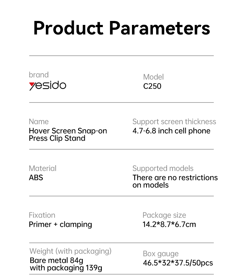 C250 Hover Screen Snap-on Press Clip StandC295 Yesido 360 Rotation Adjustable Three-point stabilized clamping Hover Screen Snap-on Press Clip Phone Holder.HPS offer 0.5J/1J/2J/3.5J/4.8J(AC/AC&DC/SOLAR).FeaturesMaterial: ABS + PC.360 degree Rotating Clamp Arm.Screen corner Using.Easy Extending Clip.C250 Hover Screen Snap-on Press Clip Stand ParameterBrand:YesidoProduct Name:Hover Screen Snap-on Press Clip StandMode:C250Apply to:For Computer ScreenMaterial:ABS + PCApplicable items:4.7-6.8 inchesmolie phone/TabletOutput:G.W:137GC250 Hover Screen Snap-on Press Clip Stand ParameterProduct CompositionC250 Hover Screen Snap-on Press Clip Stand1. Clip the phone holder to the computer screen.2. put the mobile phone on and start using.C250 Hover Screen Snap-on Press Clip Stand DetailsFAQ1. what is the delivery time of the C250 Hover Screen Snap-on Press Clip Stand?Usually, the delivery time will be within 5-7 days.2. What you can do in OEMWe can help to design the customer’s logo on the products, and help to design the product packaging according to our standard3. How long is your warranty time?from the selling date, last for 1 year.