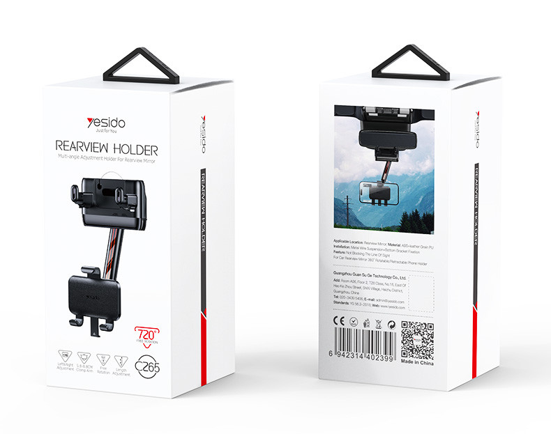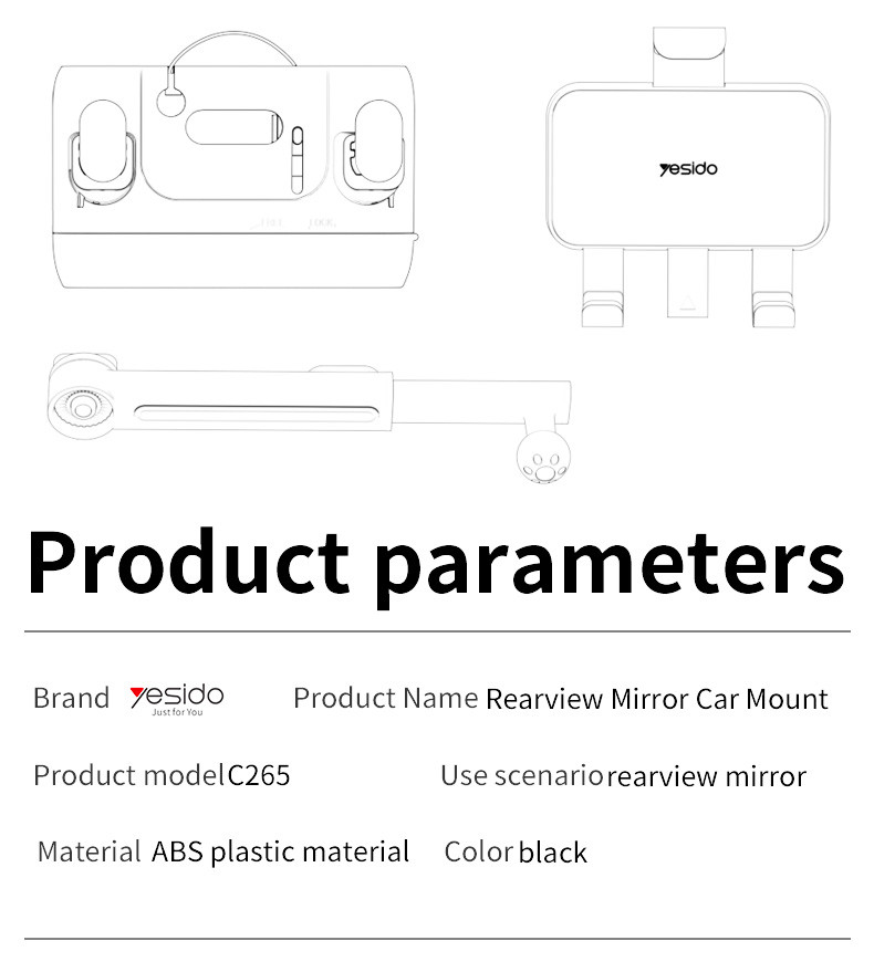 C265 Car Rearview Mirror Phone HolderC265 Yesido 360°Adjustable Rotation Length Adjustable Rearview Mirror Car Phone Holder For Various Scenarios.HPS offer 0.5J/1J/2J/3.5J/4.8J(AC/AC&DC/SOLAR).FeaturesCar Rearview Mirror Using.made from ABS+PC +Metal.Rotating Long Clamp Arm.Spring Clip.C265 Car Rearview Mirror Phone HolderParameterBrand:YesidoFixing method:Car Rear View MirrorMode:C265Apply to:Car Rear View MirrorMaterial:ABS plastic materialApplicable items:All kinds of mobile phoneOutput:G.W:232GC265 Car Rearview Mirror Phone HolderParameterProduct CompositionHolder HeadSucntion Cup Base1. Assemble the holder2. Press the holder on to car rear view mirror3. Open the clip4. put the mobile phone on and start usingC265 Car Rearview Mirror Phone Holder DetailsFAQ1. what is the delivery time of theC265 Car Rearview Mirror Phone Holder?Usually, the delivery time will be within 5-7 days.2. What you can do in OEMWe can help to design the customer’s logo on the products, and help to design the product packaging according to our standard3. How long is your warranty time?from the selling date, last for 1 year.