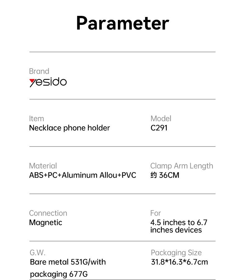 C291 Neck Mounted Lazy Phone HolderC291 High Quality Magnetic Connection Soft poem layer Liquid Silicone Necklace Phone Holder.Featuresmade from ABS+PC +Metal.Mounting on Neck or table.Bendable Clamp Arm for angle.360 degree rotating.C291 Neck Mounted Lazy Phone Holder ParameterBrand:YesidoFixing method:StandMode:C291Apply to:Mounting on Neck or tableMaterial:ABS+PC+Aluminum AIlou+PVCApplicable items:mobile phoneOutput:G.W:539GC291 Neck Mounted Lazy Phone Holder ParameterProduct Composition1. Press the phone holder on to table or Floor.2. put the mobile phone on and start using.C291 Neck Mounted Lazy Phone Holder DetailsFAQ1. what is the delivery time of theC291 Neck Mounted Lazy Phone Holder?Usually, the delivery time will be within 5-7 days.2. What you can do in OEMWe can help to design the customer’s logo on the products, and help to design the product packaging according to our standard3. How long is your warranty time?from the selling date, last for 1 year.