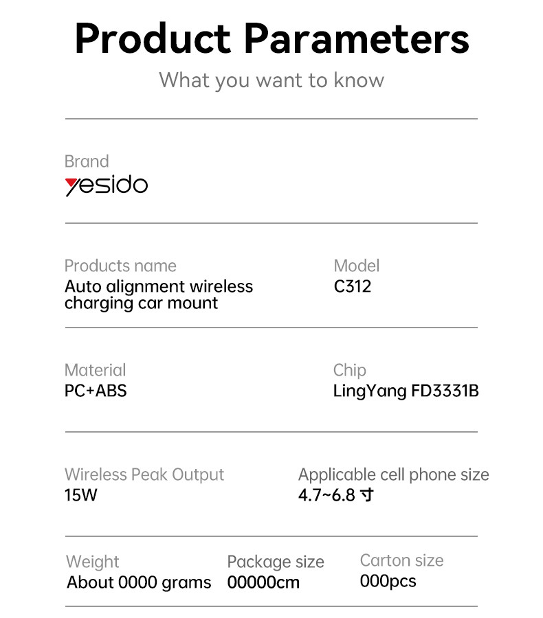 C312 Auto Alignment Wireless Charging Phone HolderC312 Yesido Motorized Clamping Auto Alignment 15W Wireless Charging Car Air Vent Phone Holder.HPS offer 0.5J/1J/2J/3.5J/4.8J(AC/AC&DC/SOLAR).FeaturesMaterial: PC+ABS.Electronic Clamp Arm.Auto Alignment Support Stand.Positioning the best charging.Charging Power: 15W.Built-in with EDLC, can support.the hold open without power.C312 Auto Alignment Wireless Charging Phone Holder ParameterBrand:YesidoProduct Name:Auto Alignment Wireless Charging Phone HolderMode:C312Apply to:For Car Air VentMaterial:ABS + PCApplicable items:4.7-6.8 inch molie phoneOutput:15WG.W:297GC312 Auto Alignment Wireless Charging Phone Holder ParameterProduct CompositionHolder HeadSpring Clip1. Press the holder on to Car Air Vent.2. put the mobile phone on and start using.C312 Auto Alignment Wireless Charging Phone Holder DetailsFAQ1. what is the delivery time of the C312 Auto Alignment Wireless Charging Phone Holder?Usually, the delivery time will be within 5-7 days.2. What you can do in OEMWe can help to design the customer’s logo on the products, and help to design the product packaging according to our standard3. How long is your warranty time?from the selling date, last for 1 year.